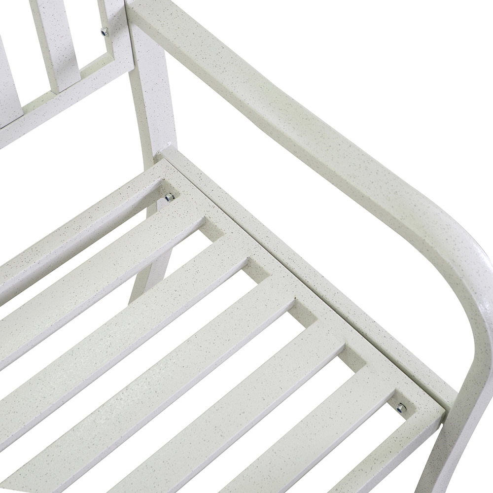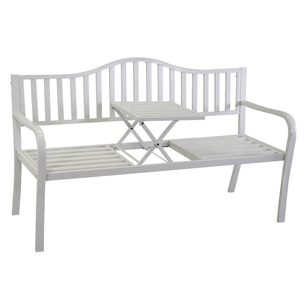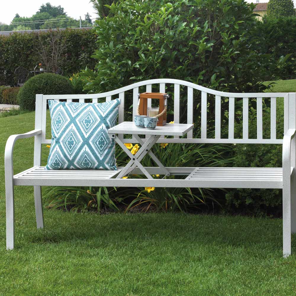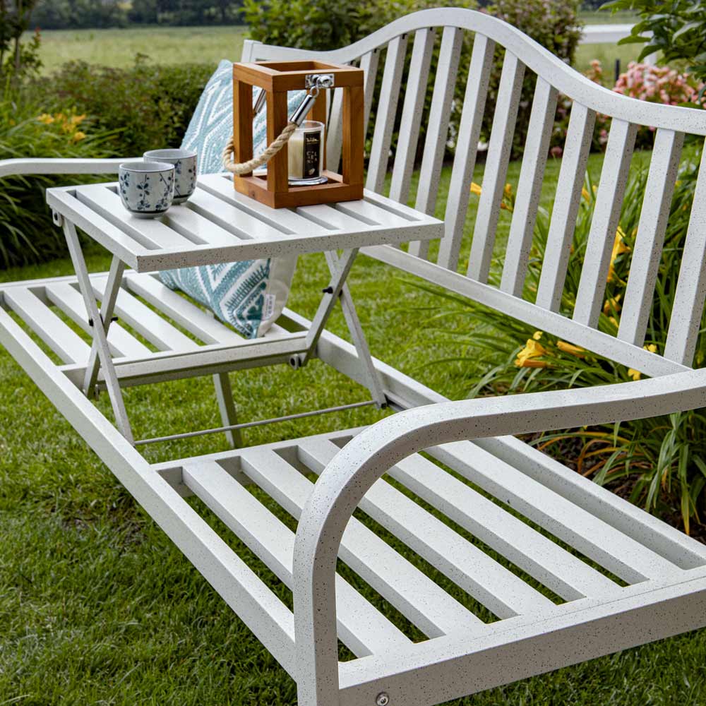 Den hvide finish matcher nemt ethvert udendørs miljø og tilføjer et strejf af moderne stil. Højdepunktet på denne bænk er det udfoldelige bord , der er perfekt til at opbevare drikkevarer, bøger eller småting, og som forvandler bænken til et praktisk multifunktionelt rum på få sekunder.
