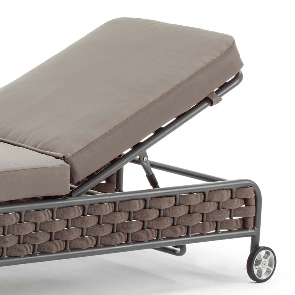 Havechaiselong med indvendig struktur i antracitmalet aluminium svøbt i en elegant vævning i brun finish polyesterreb og aftagelige hynder i vandafvisende gummi betrukket med brunfarvet akrylstof .