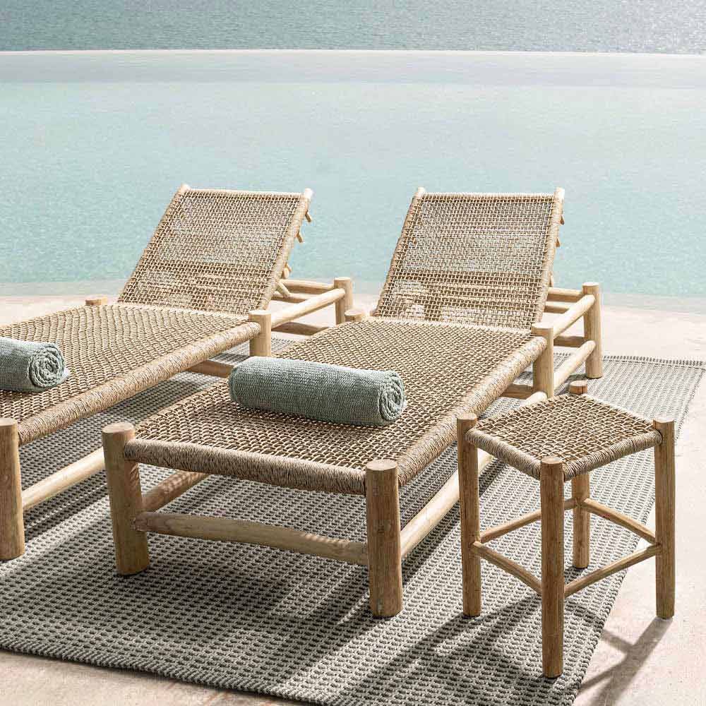Udendørs liggende chaiselong i teak og syntetisk fiber.