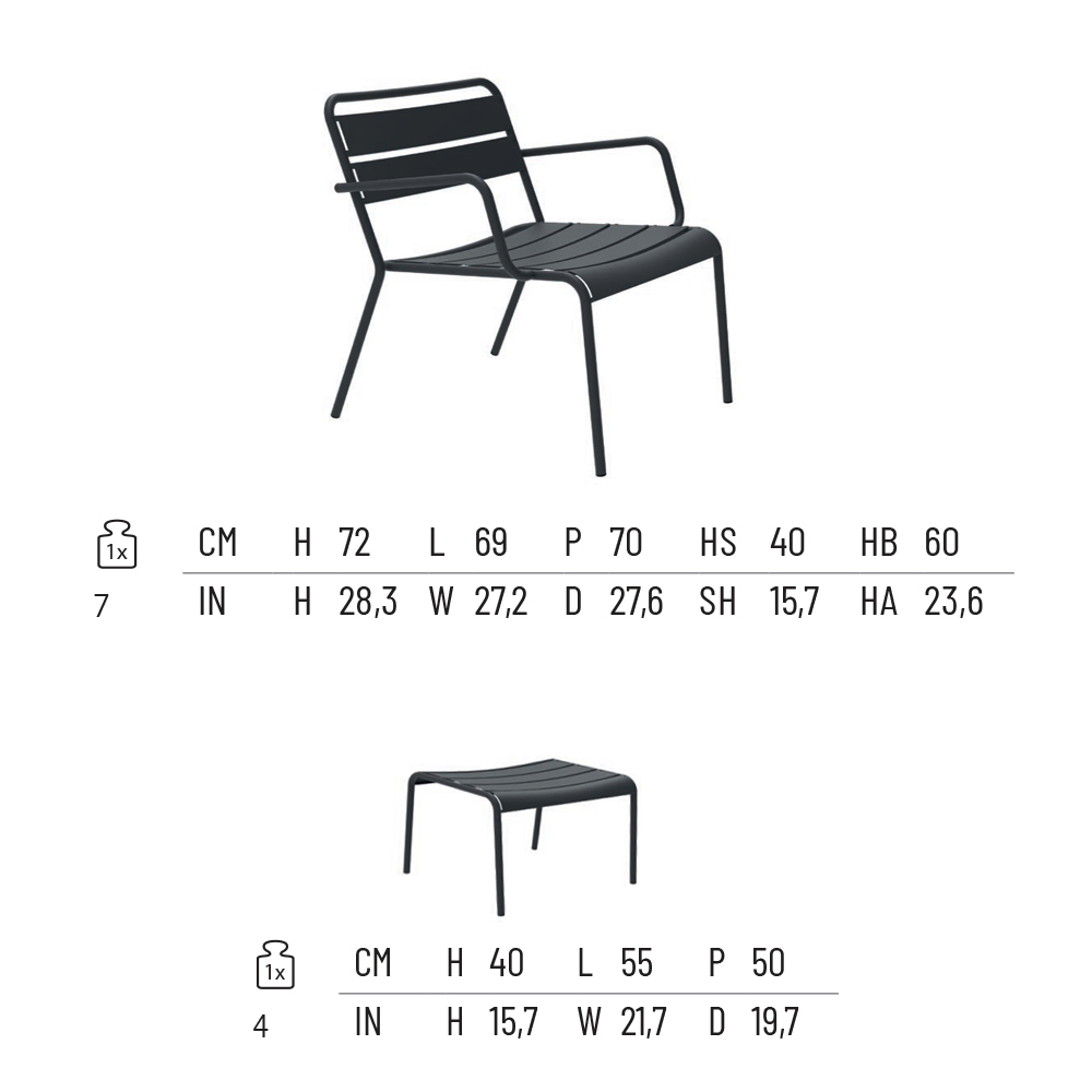 - Chaiselong : L 69 x D 70 x H 72 cm;