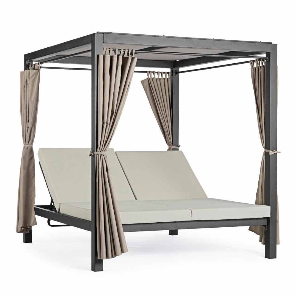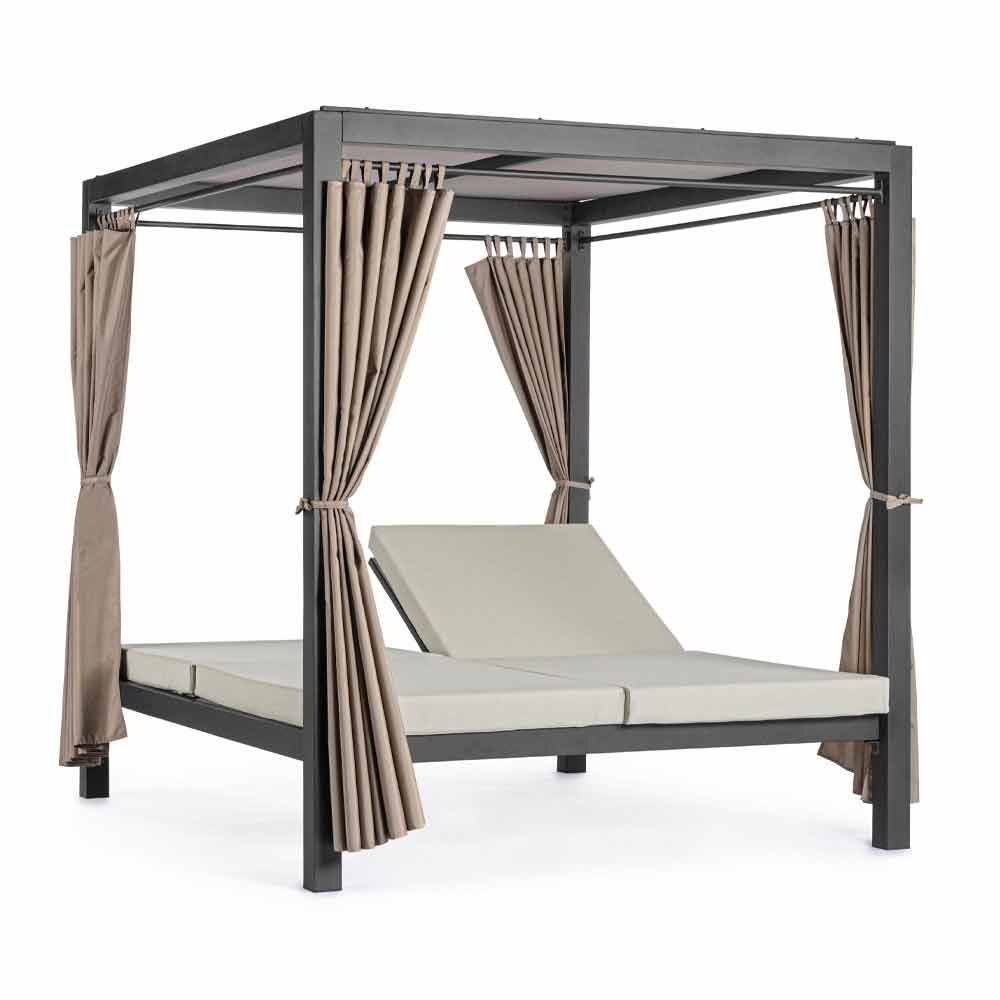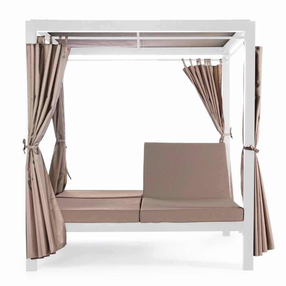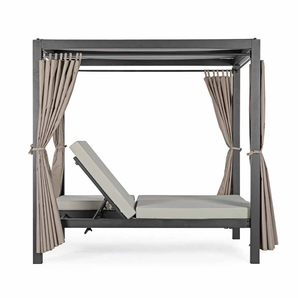 Udendørs dagseng i aluminium og tekstil med tilbagelænet ryglæn.