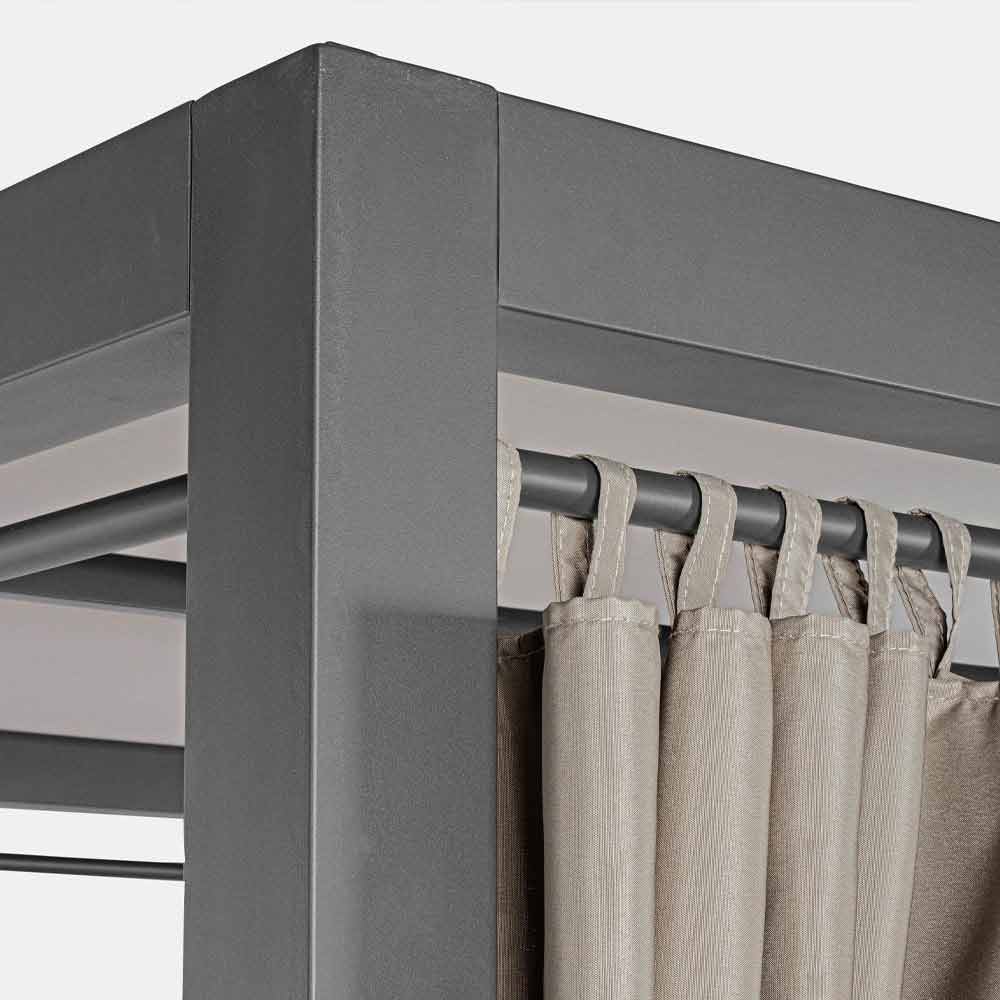 Pulverlakeret aluminiumsstruktur , 80x80mm stænger, tagklud og sædehynder (aftagelige) i 1x1 tekstilen , hurtig tør skum polstring til udendørs brug. Ryglæn med 4 positioner og sidegardiner i polyester. Skal samles.