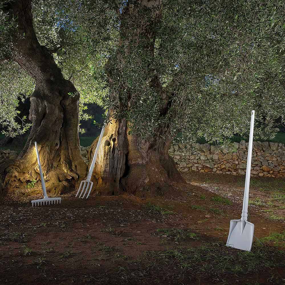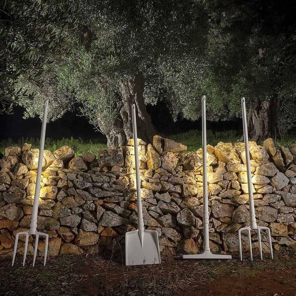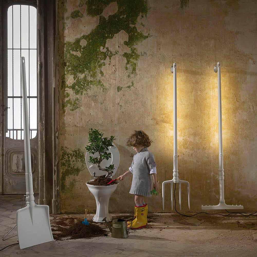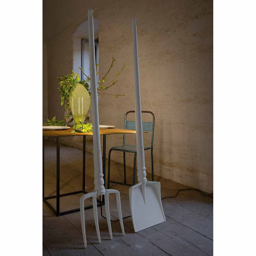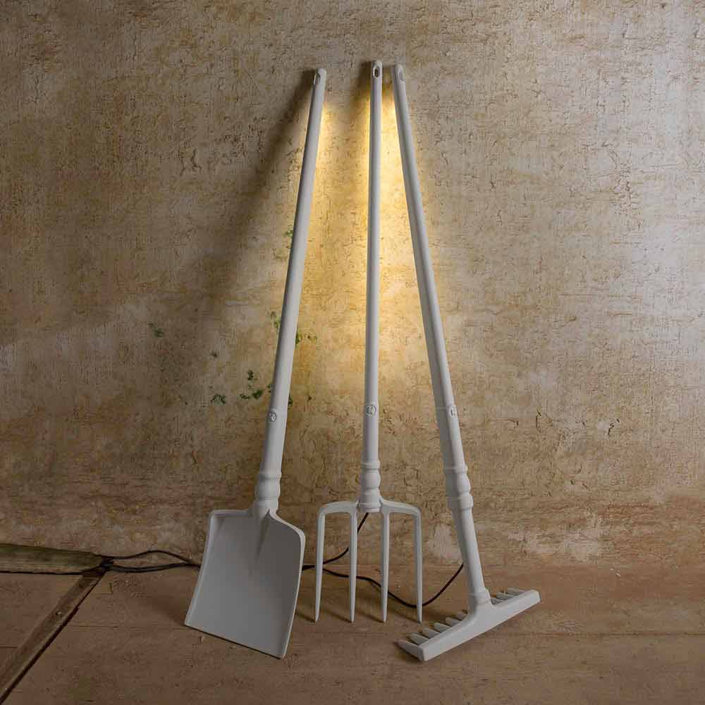 Denne originale og unikke udendørs gulvlampe er lavet i 3 forskellige former for at minde os om de værktøjer, der bruges mindre og mindre i dag: højgaffel, skovl og rive.