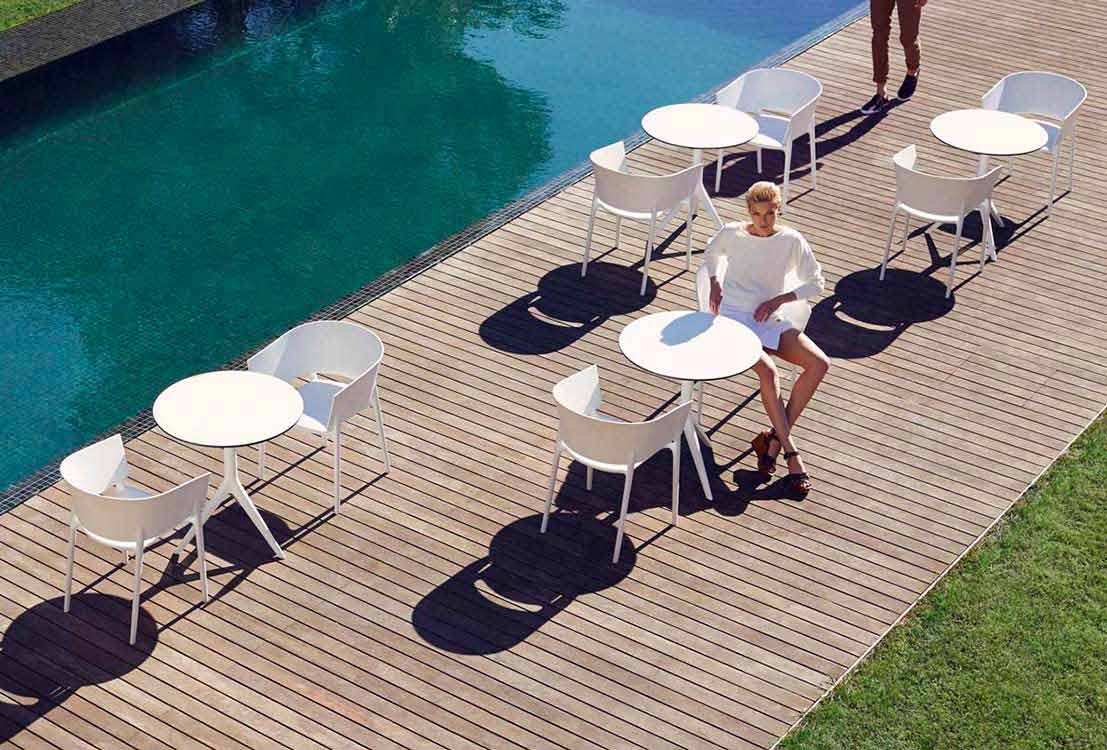 Fås i følgende farver: hvid, sort, ecrù rød, bronze, pistacie, blå og sand. Og der er også to nye funktioner: metallisk guld og metallisk sølv. De anbefales til udendørs rum.