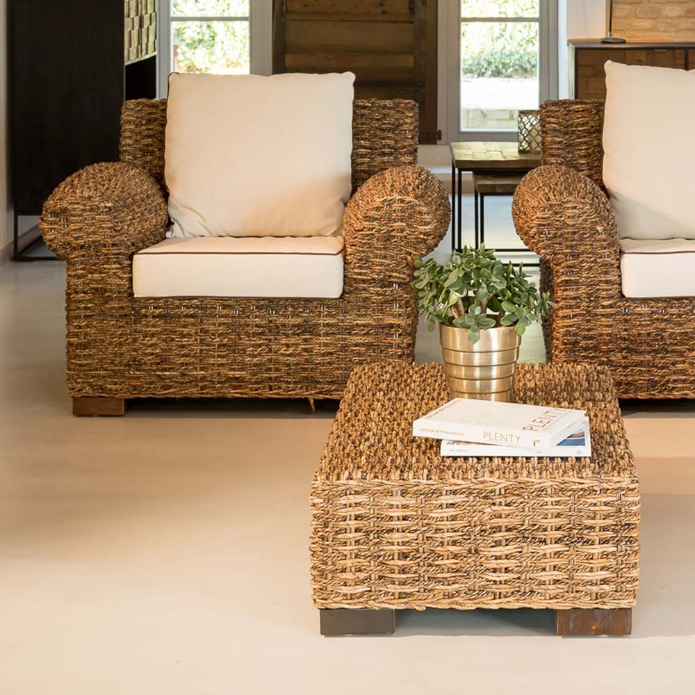 lænestolen tilhører en hel kollektion, som er unik på grund af de afrundede cylindriske armlæn og en raffineret tæt vævning af naturlige abaca-fibre, der stammer fra banantræet . Sæderne er store og udstyret med komfortable hynder.