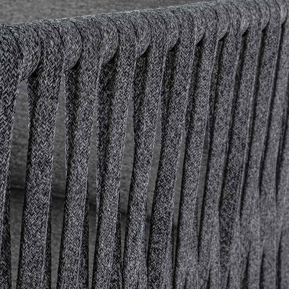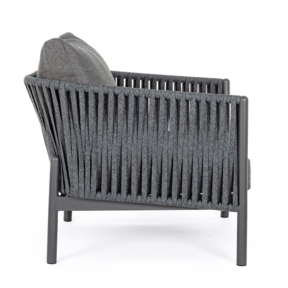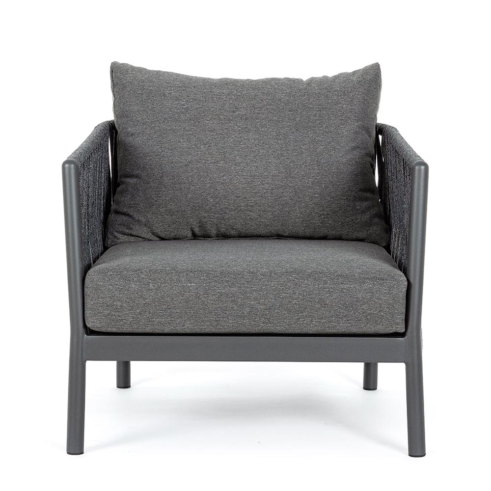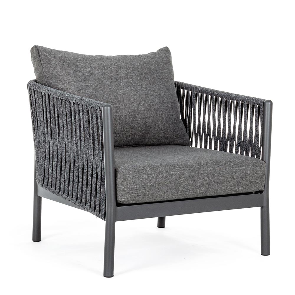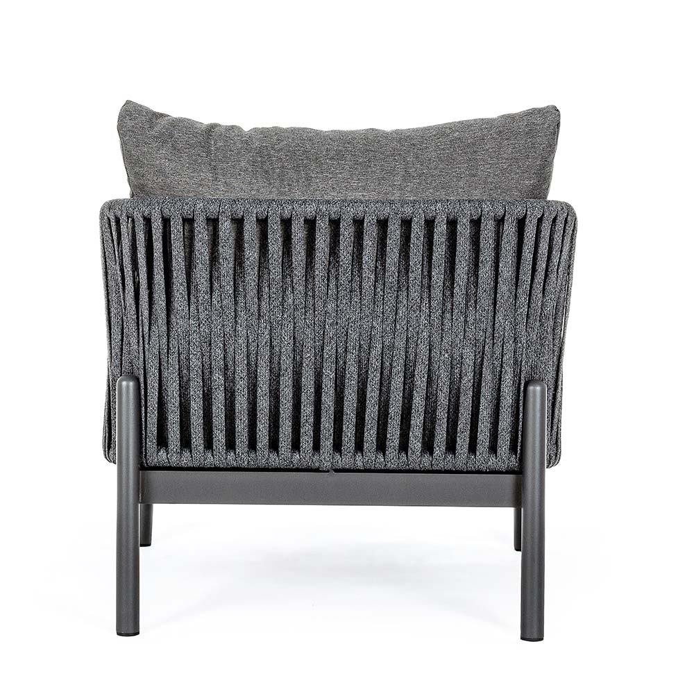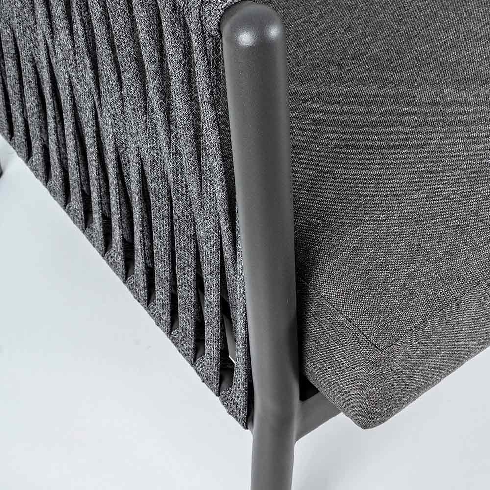 Udendørs lænestol med aluminiumsstruktur og rebvævet ryglæn.
