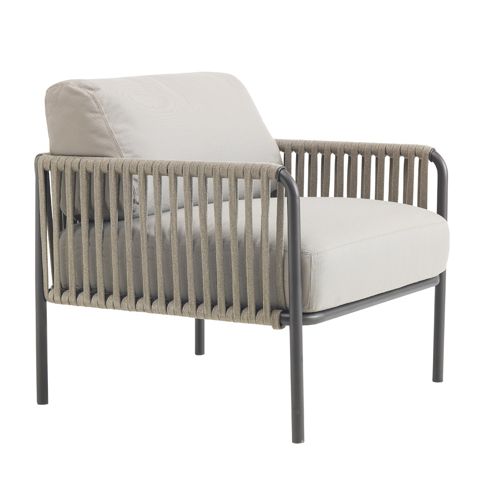 Udendørs lænestol i stål og reb med hynder. Fremstillet i Italien.