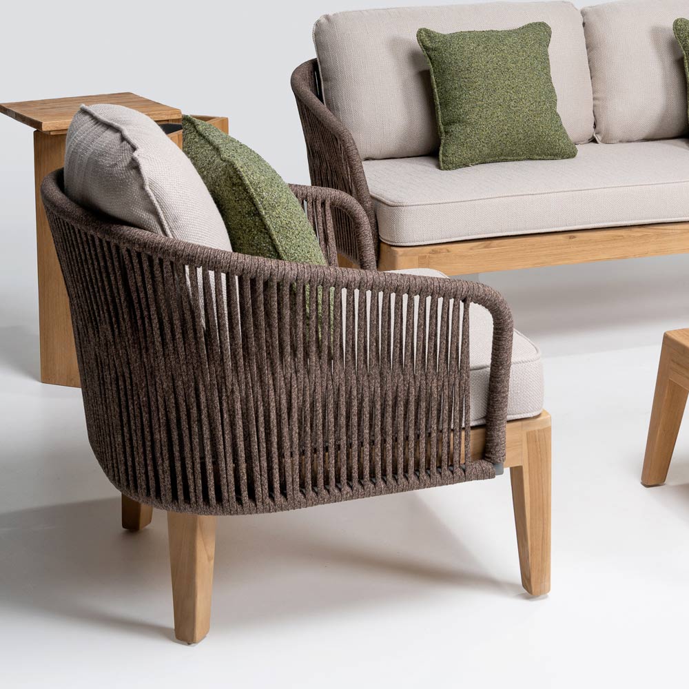 Udendørs lænestol i teaktræ og polyethylenvæv med hynder.