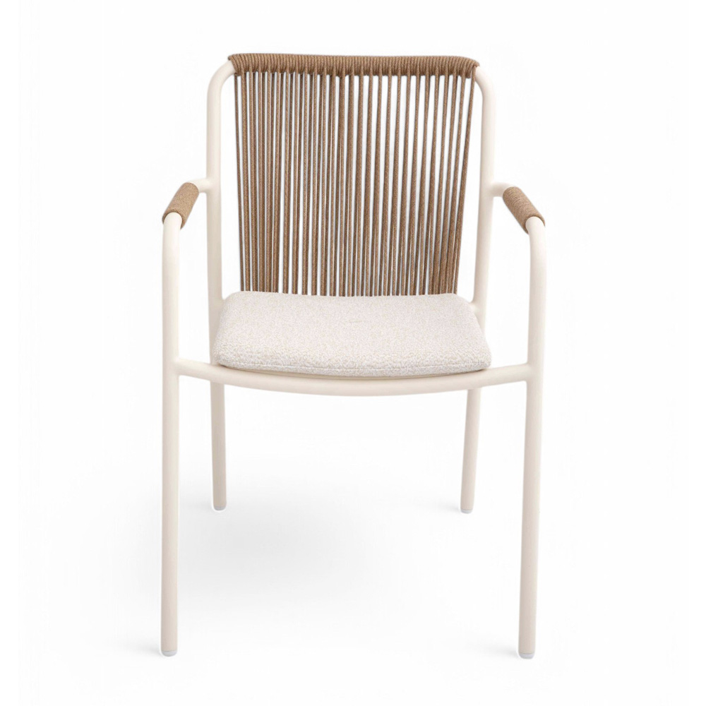 Denne udendørs stol kombinerer moderne design og ekstra komfort, hvilket gør den perfekt til dit uderum. Stellet i malet metal garanterer vejrbestandighed og holdbarhed over tid, mens reb-fletningen tilføjer et strejf af naturlig elegance .