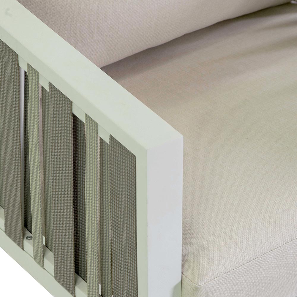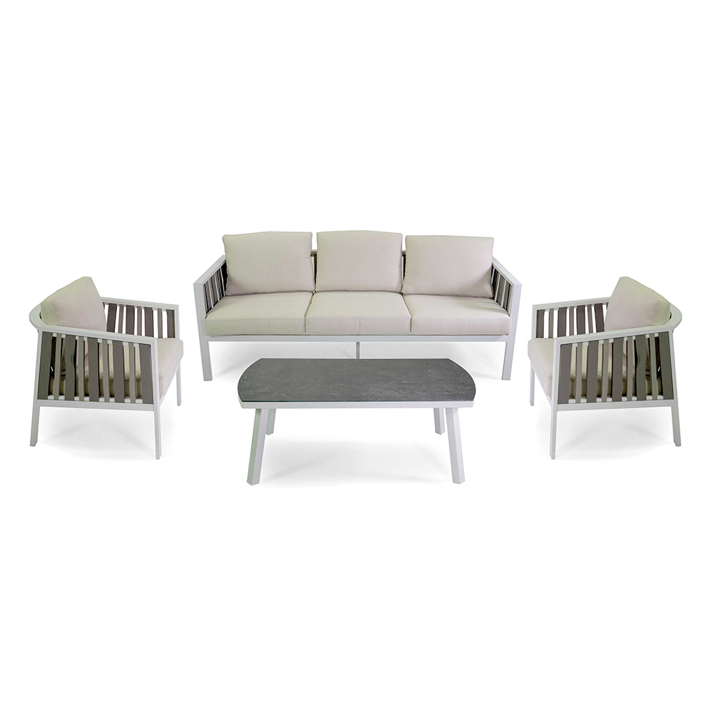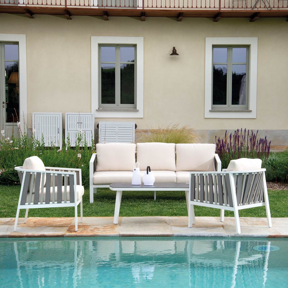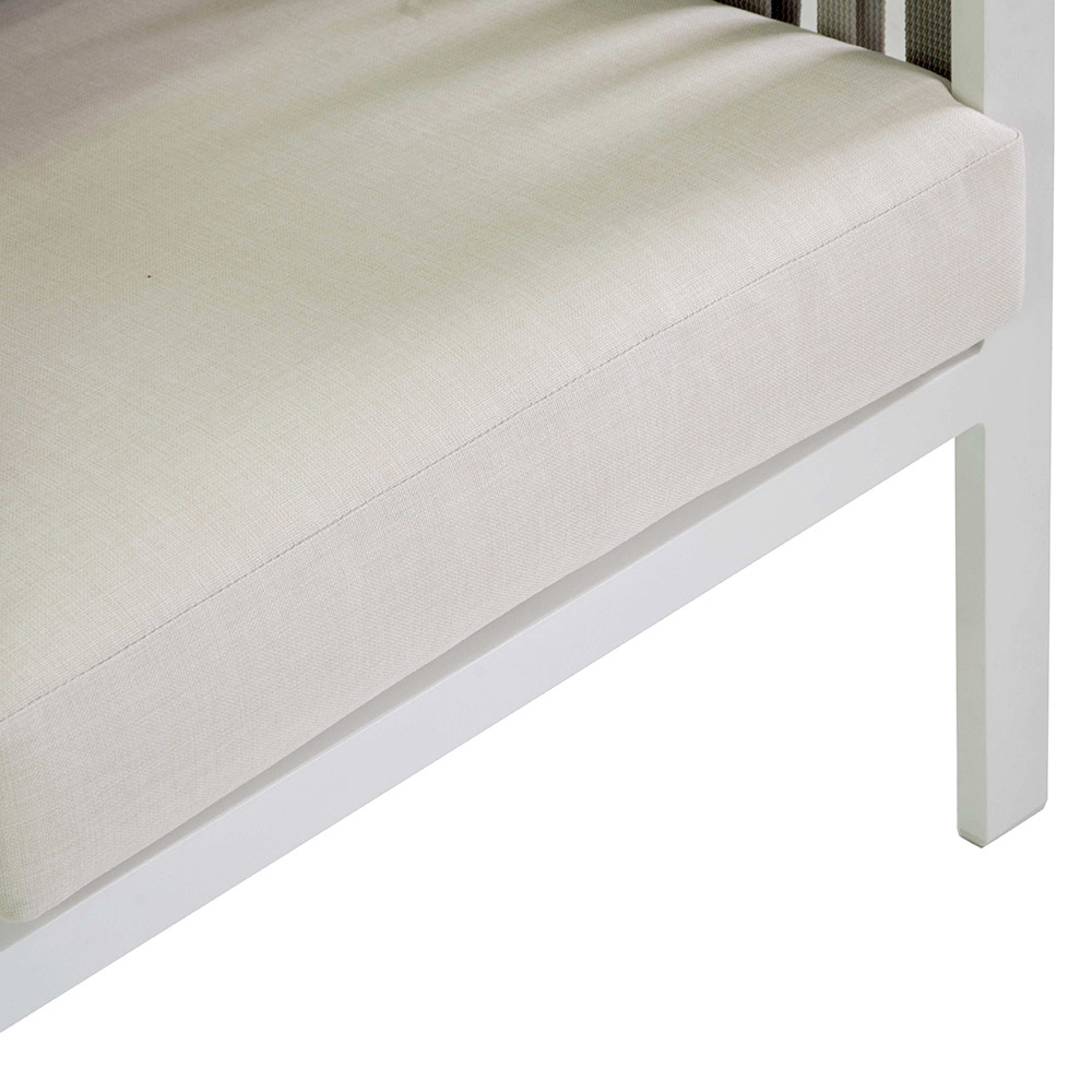 Rene linjer og et moderne design blandes med et udvalg af materialer af høj kvalitet og giver et elegant look, der øjeblikkeligt løfter ethvert udendørs rum. Sæderne er generøst polstret med vejrbestandige stofhynder, der lover uovertruffen komfort og lav vedligeholdelse.