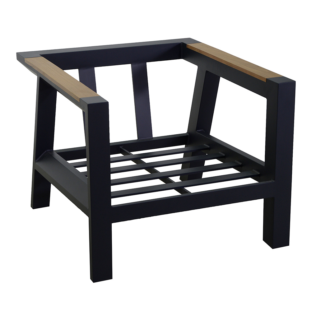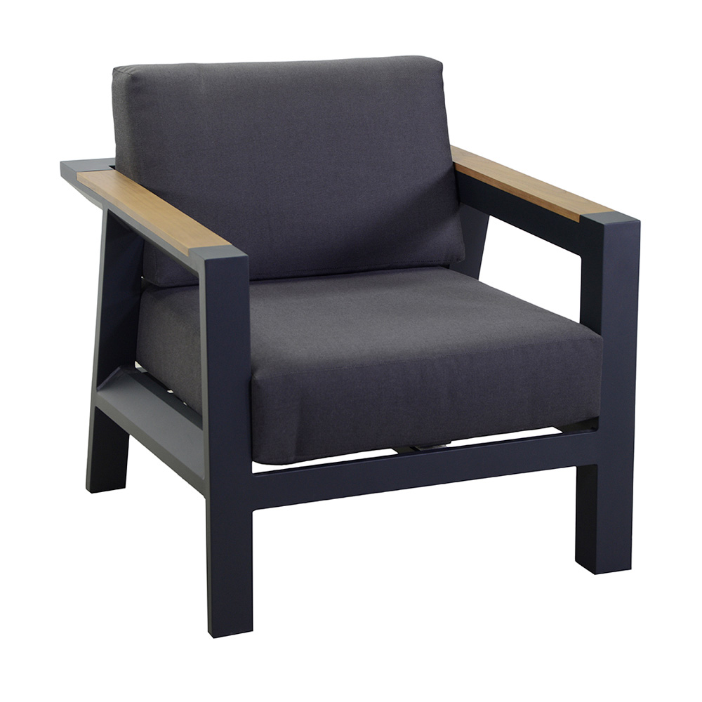 2 lænestole: stel i rustfri, pulverlakeret aluminium i antracit, vandafvisende hynder i mørkegrå polyester, aftagelige betræk og armlæn i TEAK-træ fra Brasilien
