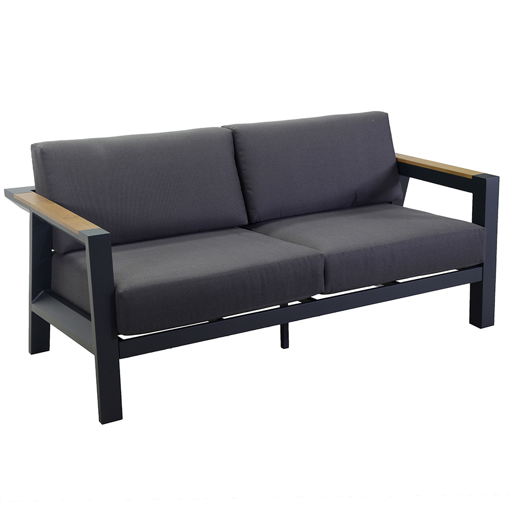 1 sofa: stel i rustfri pulverlakeret aluminium i antracit, vandafvisende hynder i mørkegrå polyester, aftagelige betræk og armlæn i TEAK-træ fra Brasilien