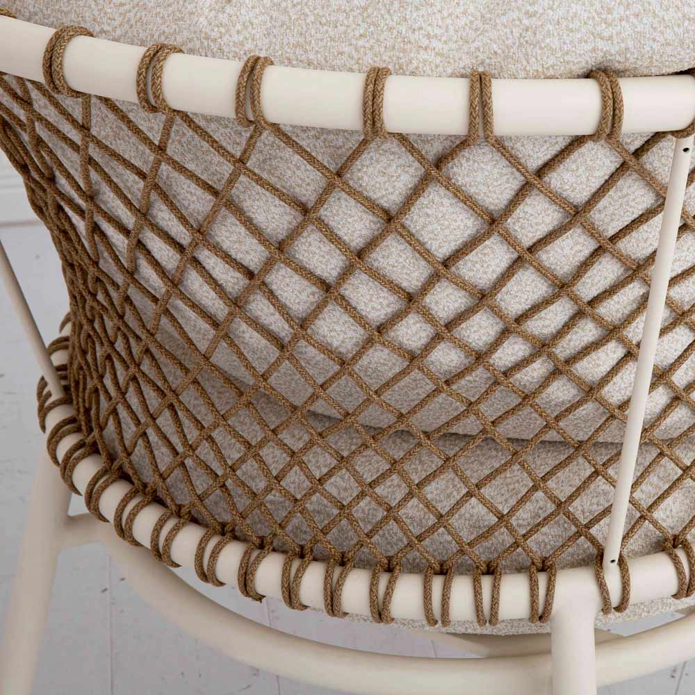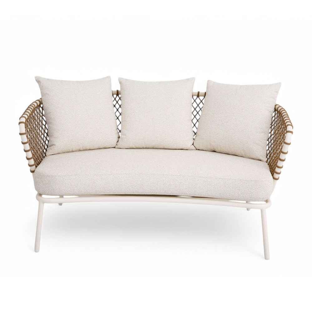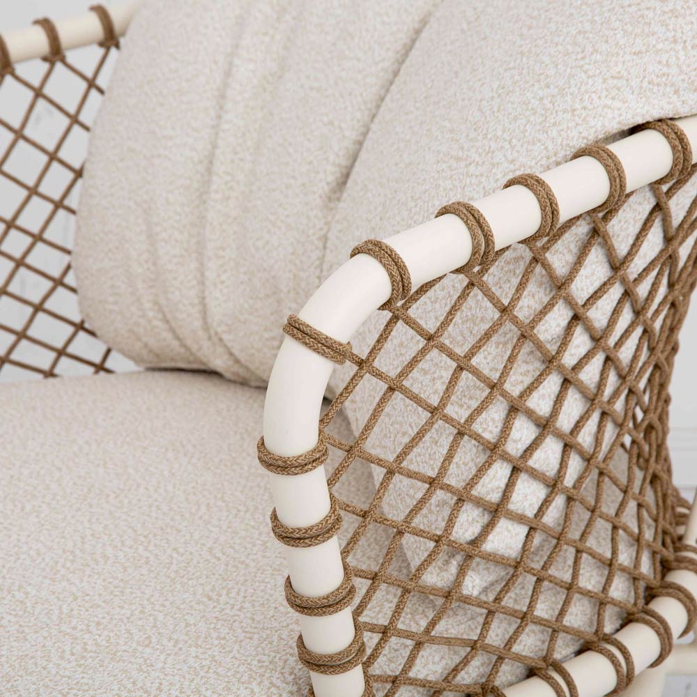 Det vævede design med syntetisk reb skaber en fascinerende og fængslende visuel effekt, perfekt til at tilføje et strejf af stil til din have eller terrasse. De bløde hynder, polstret og dækket af stof, sikrer total afslapning og overlegen komfort, ideel til dine øjeblikke med pause eller til at byde dine gæster velkommen med stil.