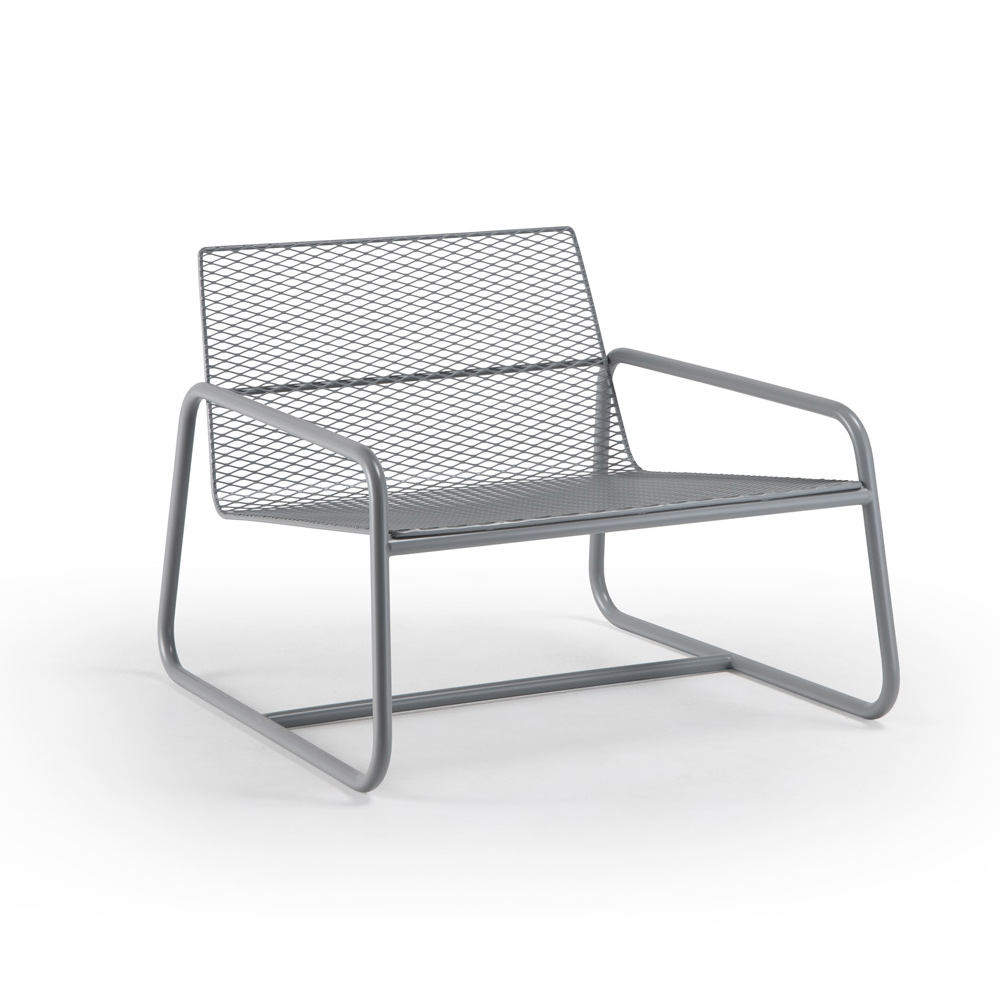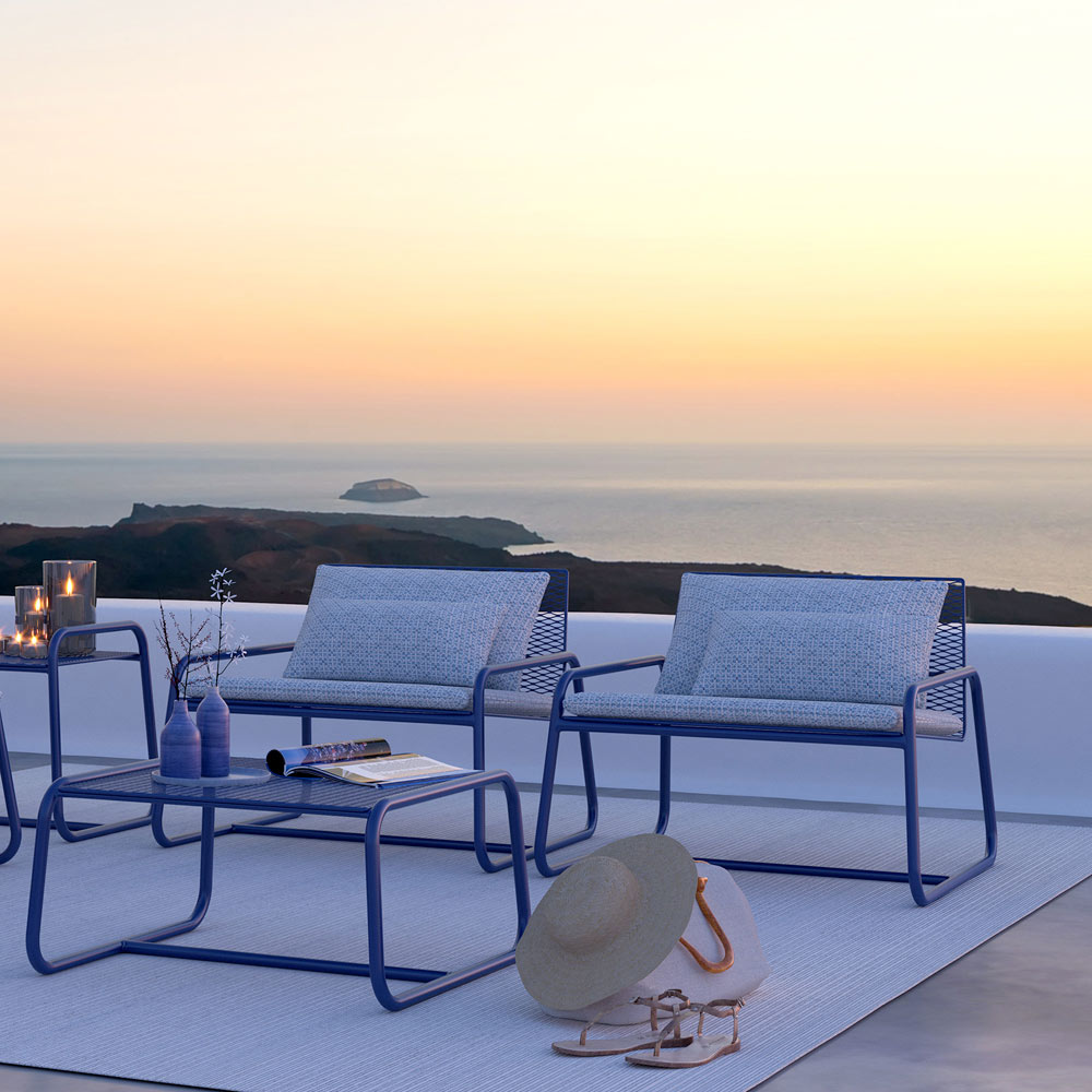 Udendørs lænestol i metal med koordinerede stofpuder, høj kvalitet fremstillet i Italien.