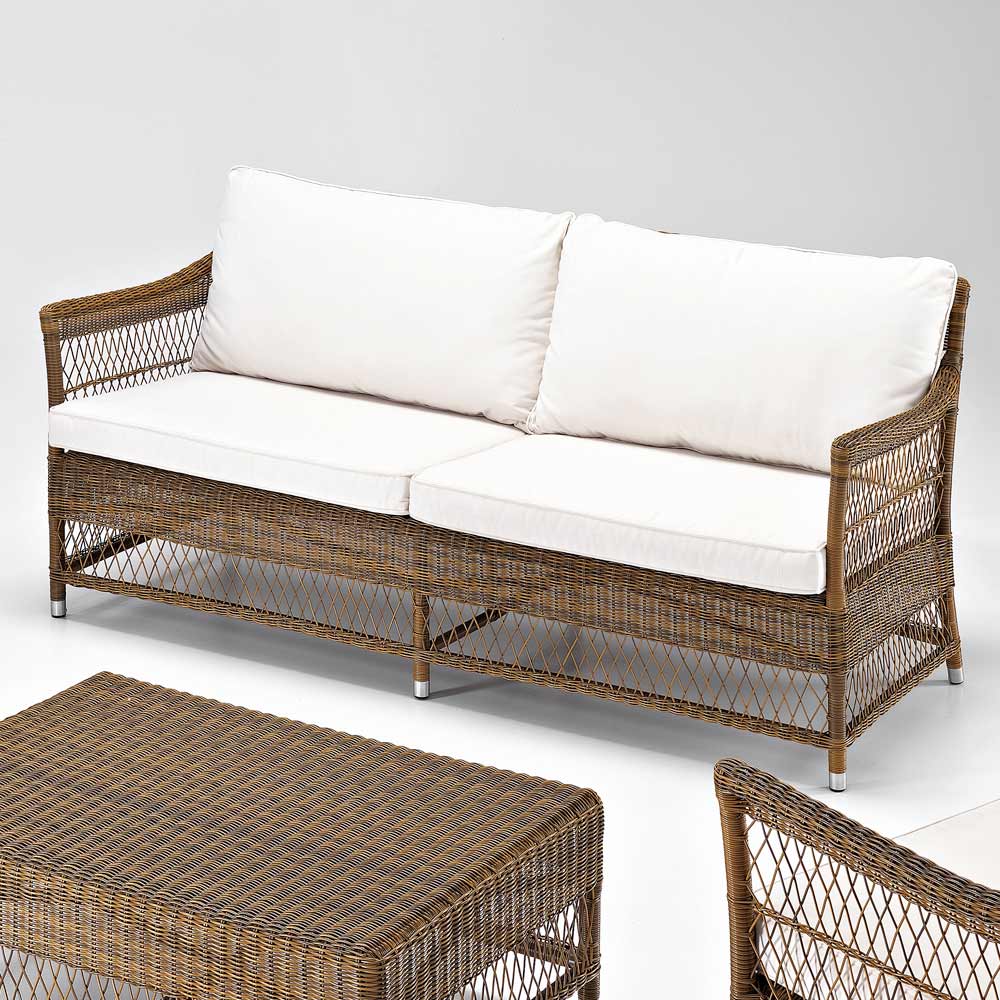 Denne sofa er kendetegnet ved sit stærke klassiske design, en stil fra fortiden, der er genoptaget i en udendørs udgave.