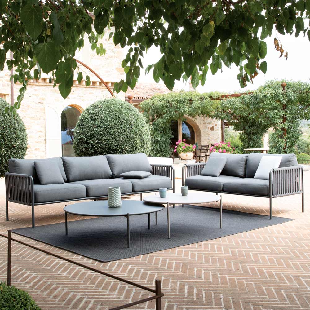 Havesofa i stål og reb i forskellige størrelser med hynder. Fremstillet i Italien.