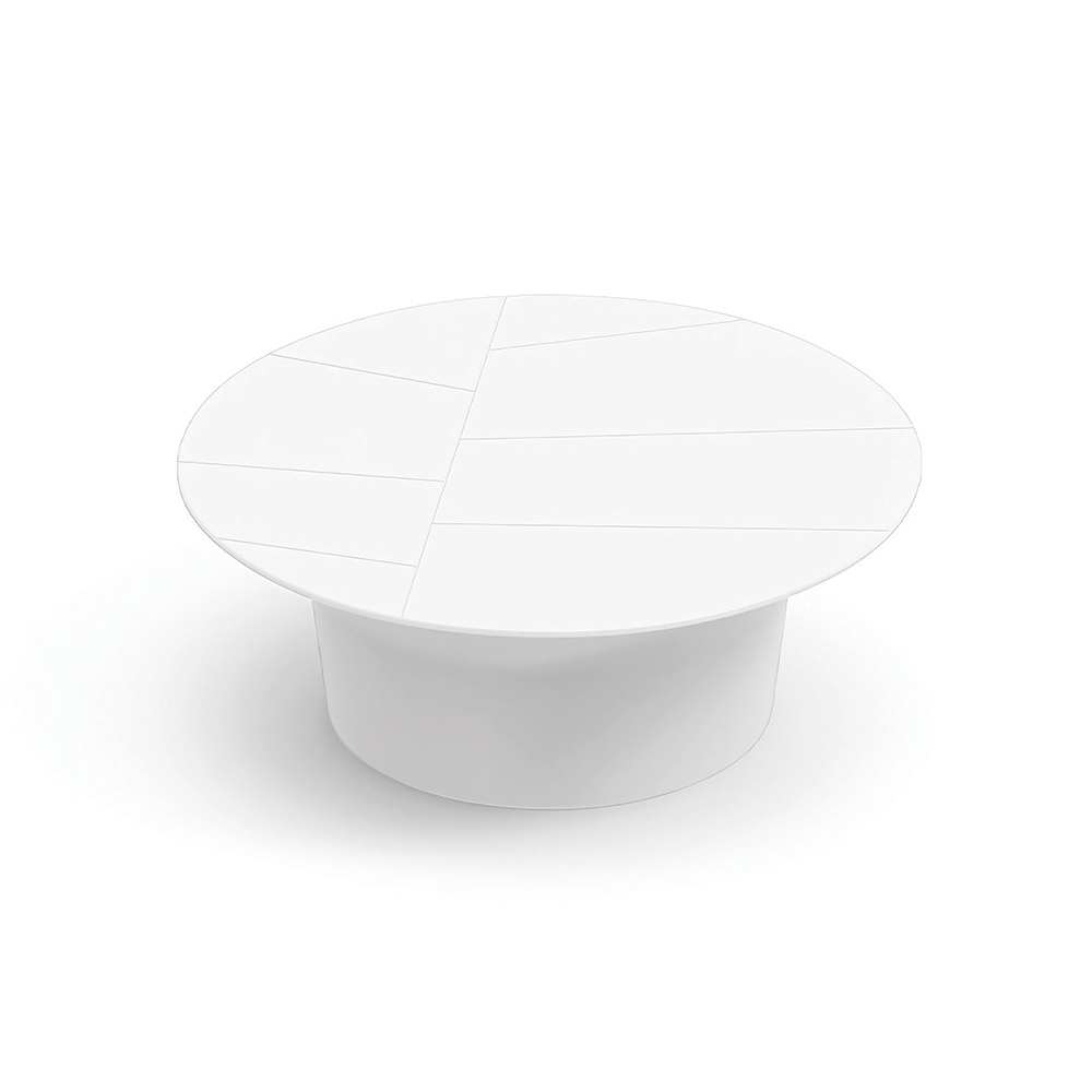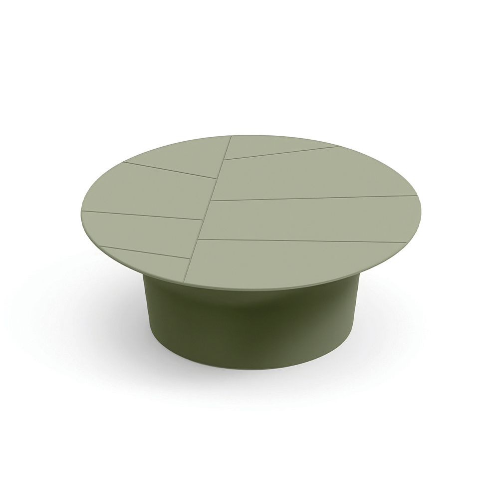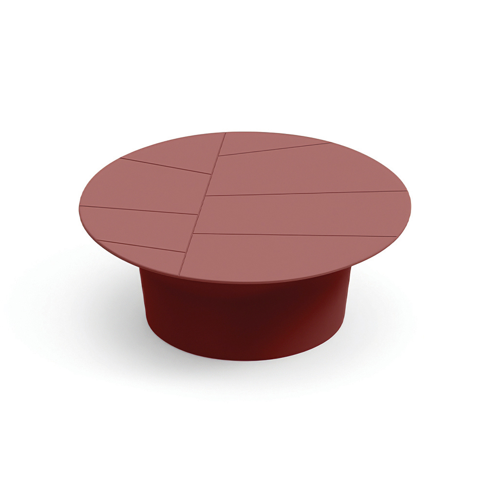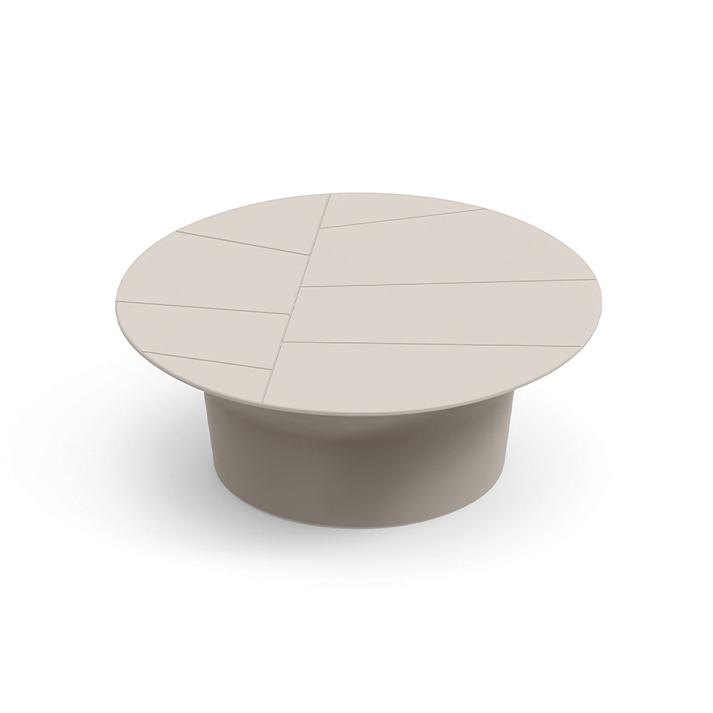 Dette sofabord er kendetegnet ved sin enkle runde form og afbalancerede proportioner, hvilket gør det til det perfekte supplement til moderne udendørsområder. Bordpladen, dekoreret med lineære geometriske indsnit , skaber en raffineret grafisk effekt, der fremhæver overfladen.