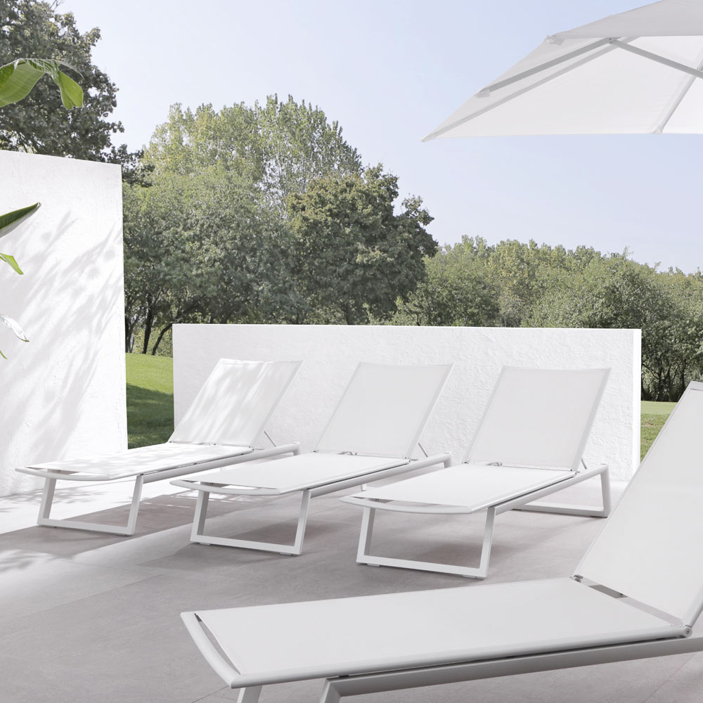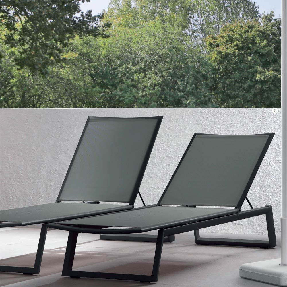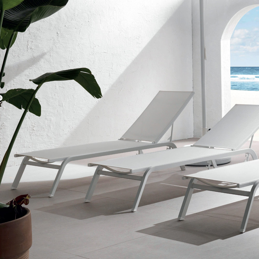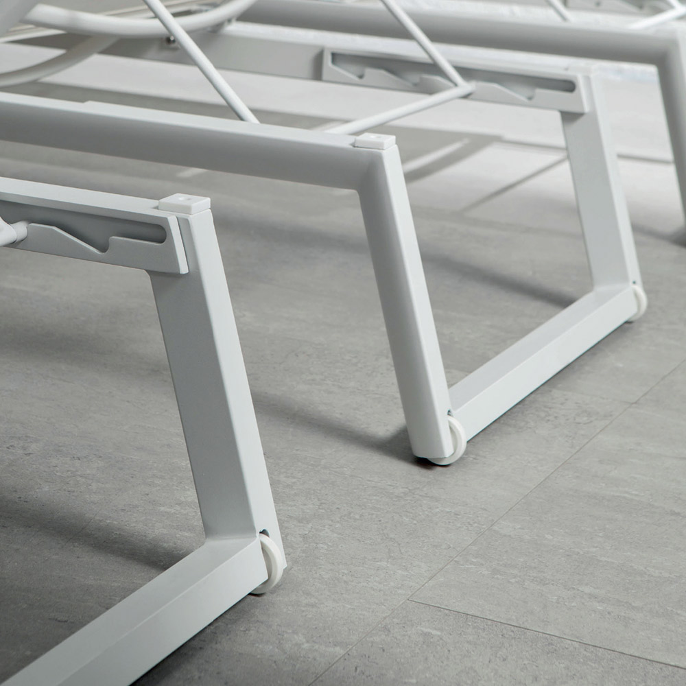 Udendørs liggestol med epoxy pulverlakeret aluminiumsstruktur kombineret med tekstilen mesh med tilbagelænet ryglæn op til 4 positioner med udtrækkelige hjul, fremragende til at sikre stor mobilitet for dette produkt.
