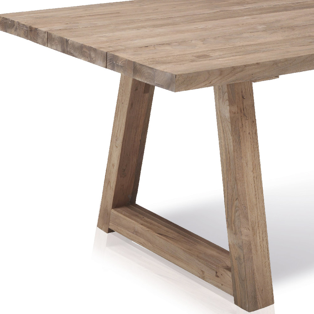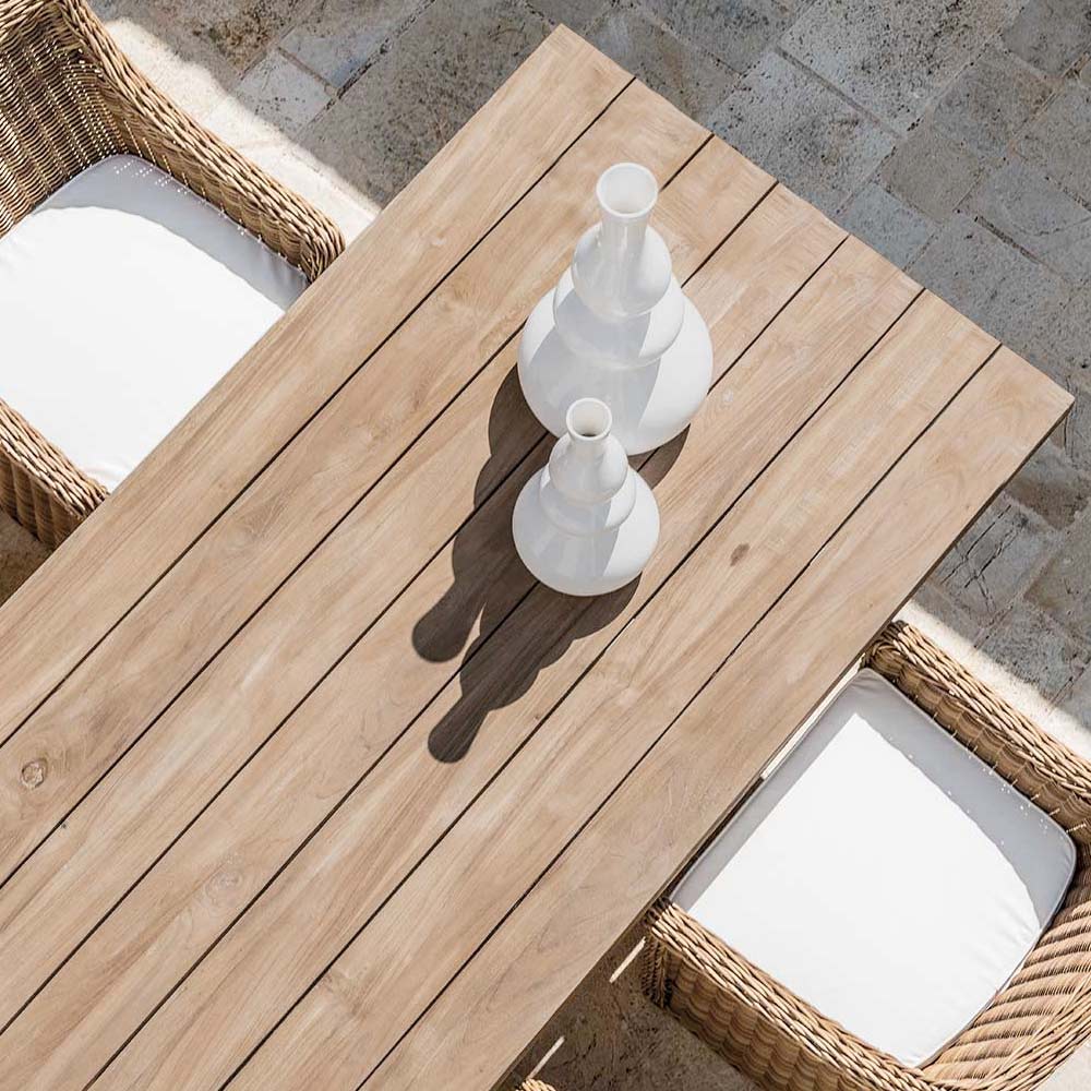 Havespisebord lavet af genbrugsteaktræ, udelukkende fremstillet i Italien. Dette bord er velegnet til ethvert udendørsmiljø, fra stuen til spisestuen og endda poolen, takket være det vejrbestandige materiale. Dets enkle, lineære finish gør bordet til en original idé for alle, der ønsker at indrette deres udendørsområde med smag og stil, uden at ofre funktionalitet og praktisk anvendelighed.