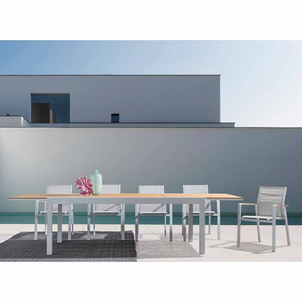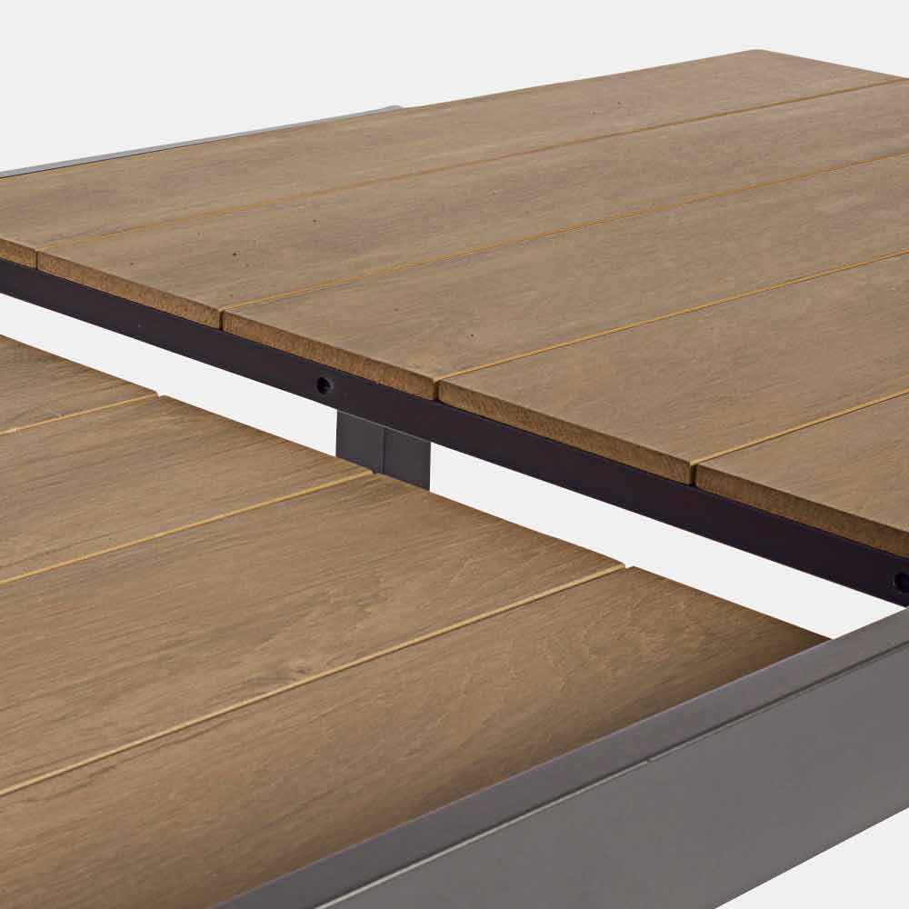 polywood (kompositmateriale med lignende udseende som træ) 90% polystyren 10% sbs teakfarve. Udtrækkelig udvidelse. Galvaniserede stålskruer.