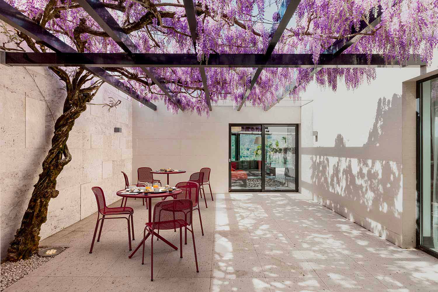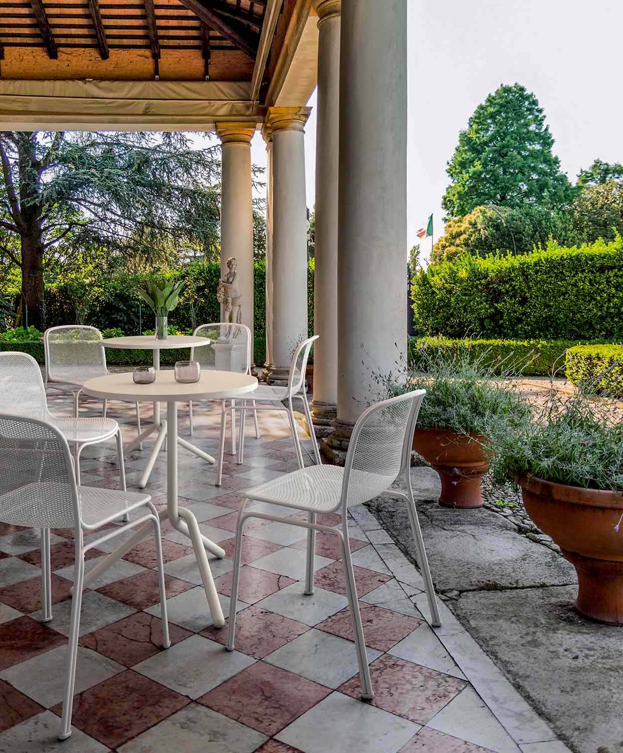 Prunella er en vidunderlig udendørs stol, der er helt lavet af metal og trådnet, der perfekt kombinerer traditionelle linjer med et moderne design, der gør stolen lys, men solid. Det er også ekstremt let at håndtere takket være den let hævede krop sammenlignet med benene. Fås i 5 farvevarianter, der gør det muligt at give personlighed til ethvert miljø.