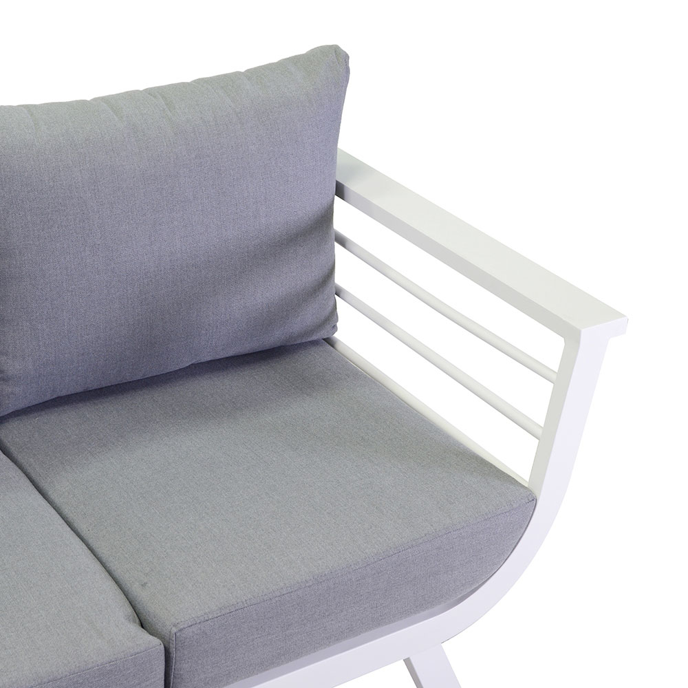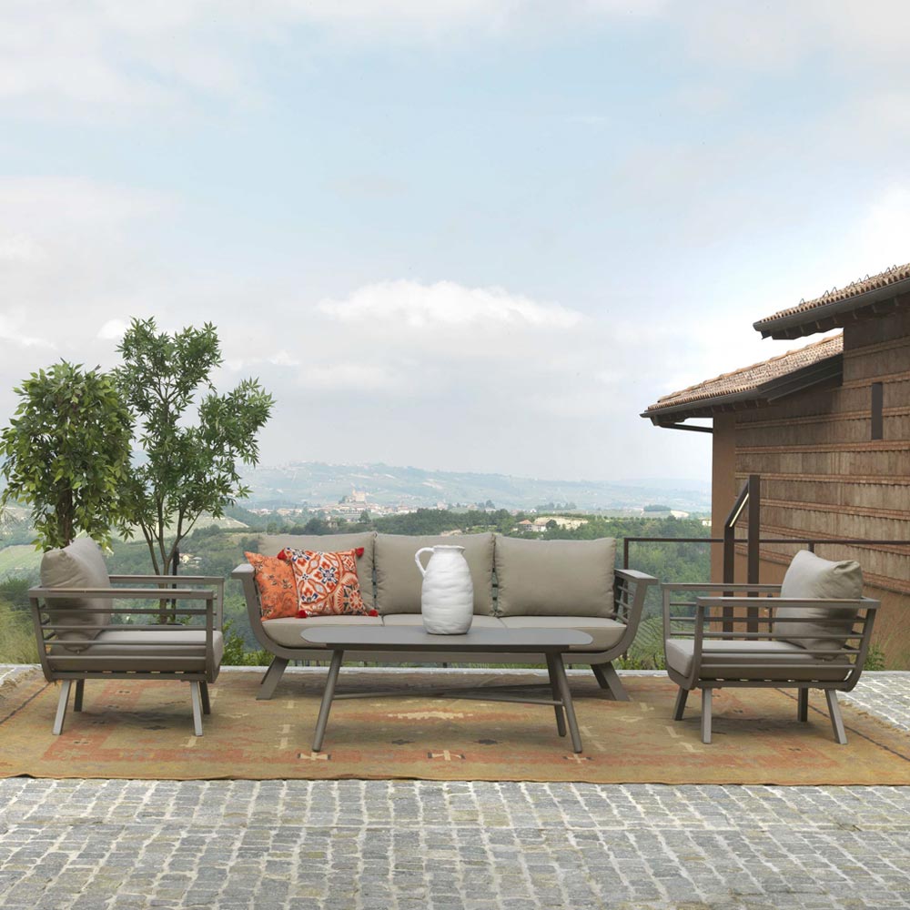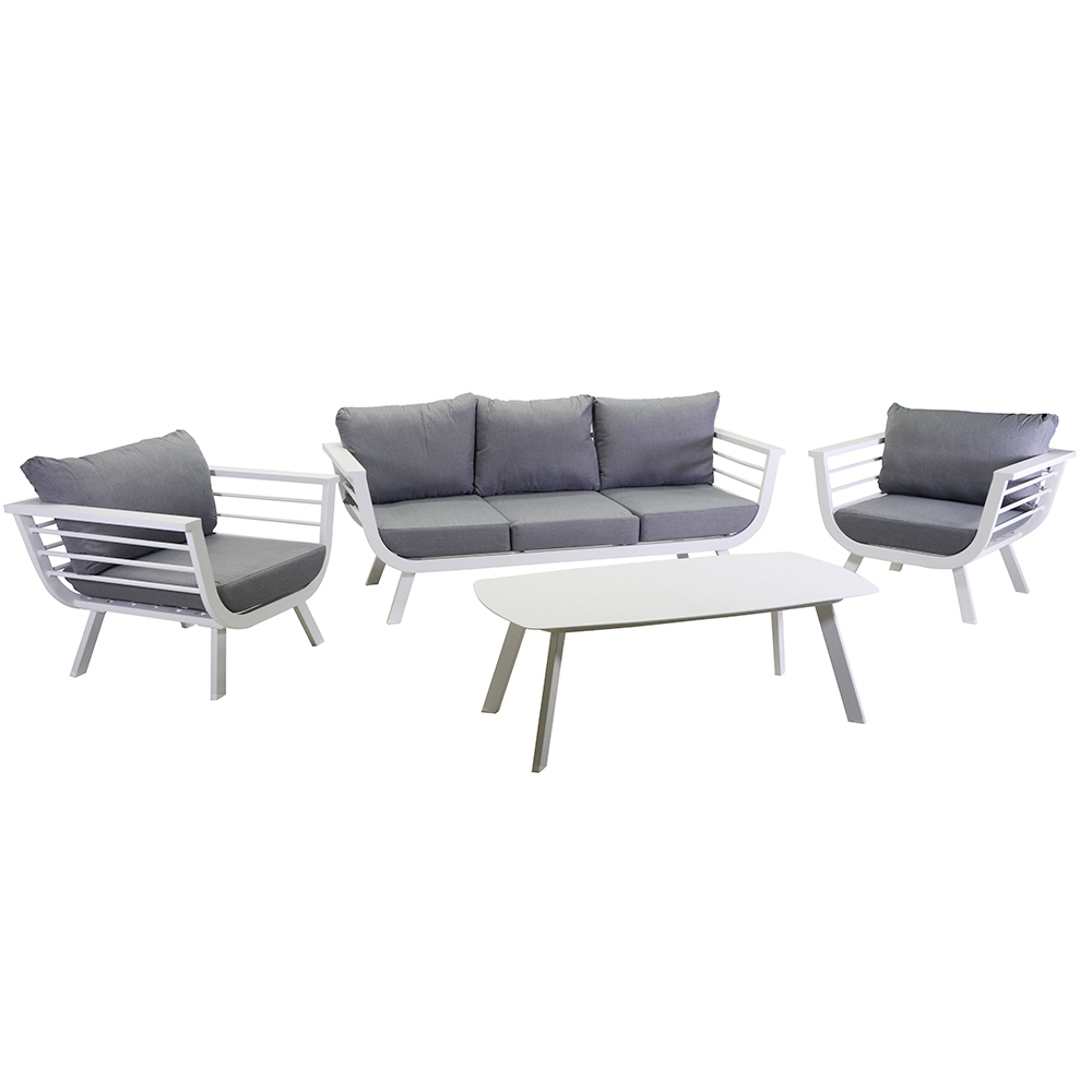 Dette elegante aluminium have-loungesæt er det perfekte valg for dem, der søger stil og komfort. Sættet består af en trepersoners sofa, to lænestole og et kaffebord, alle beriget med puder, der garanterer et meget behageligt sæde. Dette loungesæt er perfekt til afslappende stunder i haven eller på terrassen og kombinerer sofistikeret design og funktionalitet, hvilket skaber en indbydende og afslappende atmosfære.