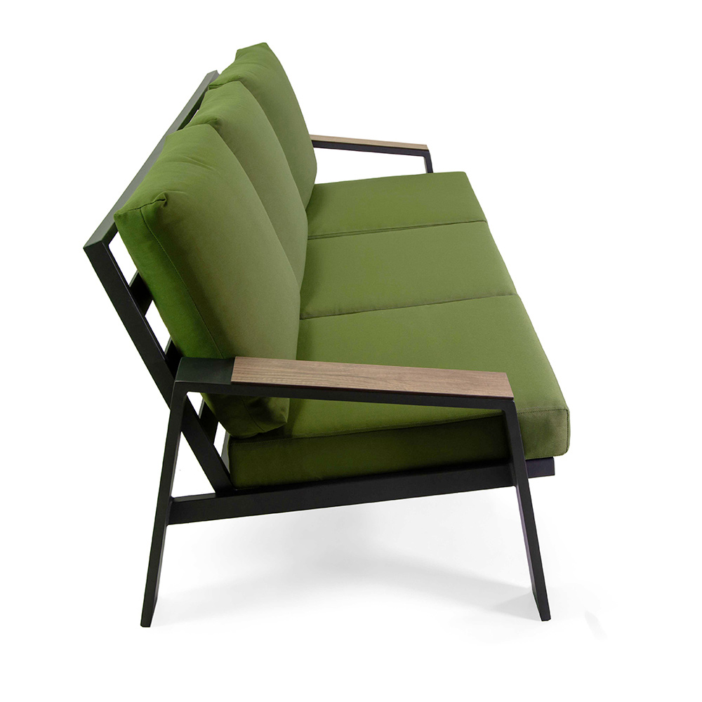 Dette olivengrønne aluminiumsloungesæt, beriget med luksuriøst polstrede hynder, giver en frisk og naturlig atmosfære til dit uderum. Sættet består af en trepersoners sofa, to enkelte lænestole og et robust sofabord med en HPL-plade med træeffekt, perfekt til at skabe et elegant og indbydende samtalehjørne i din have eller på terrassen. Det moderne design med rene linjer og lyse farver passer perfekt ind i enhver udendørs sammenhæng og tilføjer et strejf af stil og komfort.