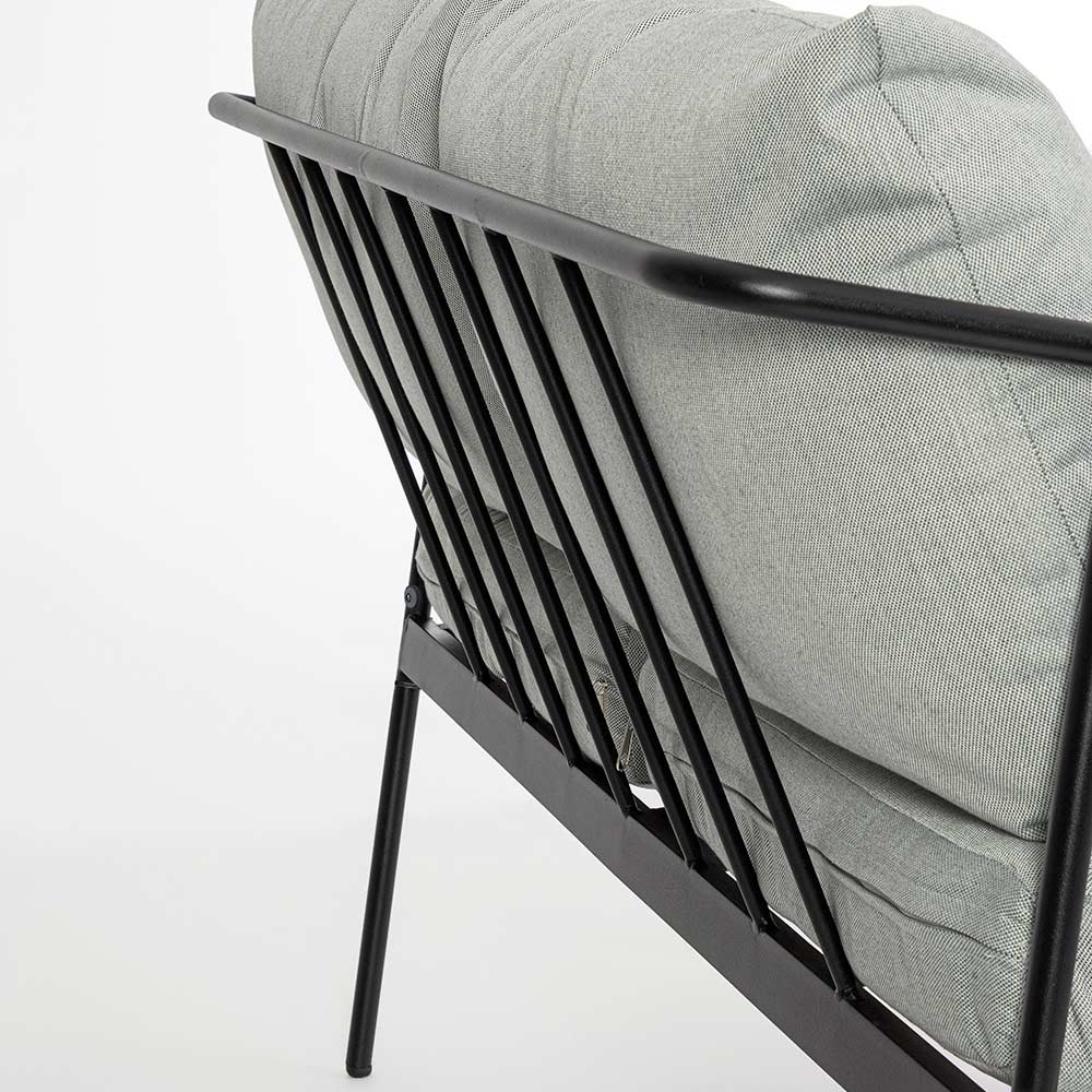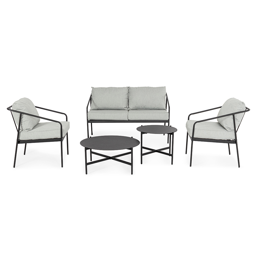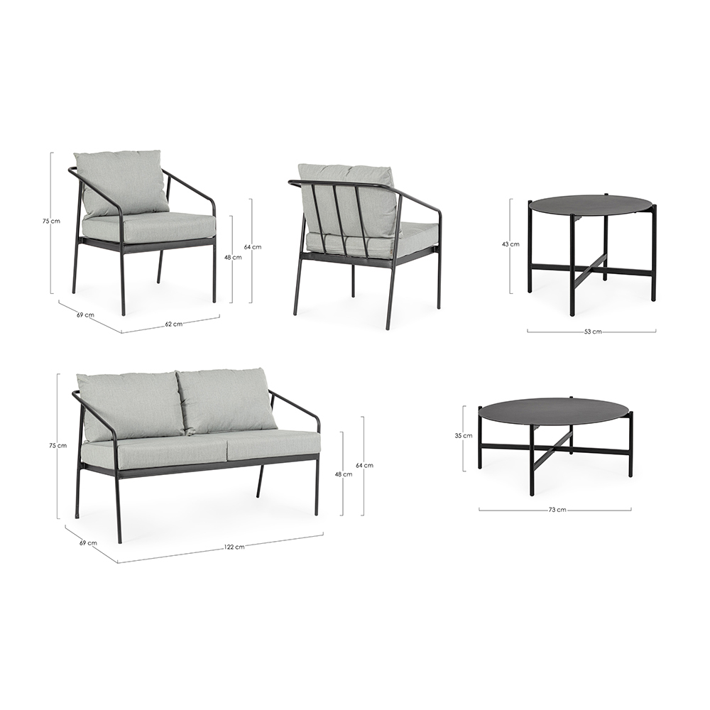 Dette haveloungesæt er en sand ode til moderne design og udendørs komfort . Hvert stykke, fra enkeltlænestolene til den to-personers sofa , er designet til at tilbyde en uovertruffen afslapningsoplevelse, takket være de bløde sæde- og rygpuder, de tilpasser sig til ethvert landskab eller stil af udendørsmøbler. Stålstrukturen er robust og designet til at modstå over tid, men den slyngede form giver sættet en visuel lethed, der forbedrer miljøet uden at tynge det ned.