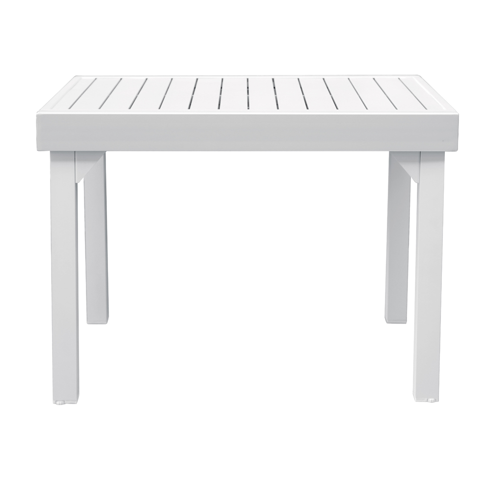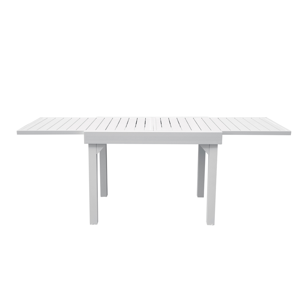 Bring stil og funktionalitet til dine udendørsarealer med dette hvide aluminiumsbord med et moderne, minimalistisk design. Bordets lamelplade giver det ikke kun et elegant udseende, men det er også praktisk, holdbart og nemt at rengøre.