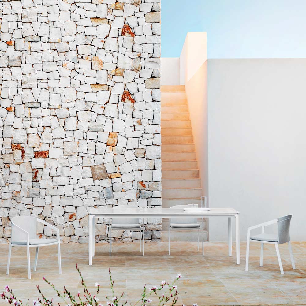 Kollektionen er kendetegnet ved detaljerne i aluminiumsbenet som et knudepunkt kombineret med den formelle og modulære strenghed af polstringen for at opleve udendørs med hensyn til maksimal afslapning og hygge, siddende i sofaen, omkring et bord eller liggende på solseng. .