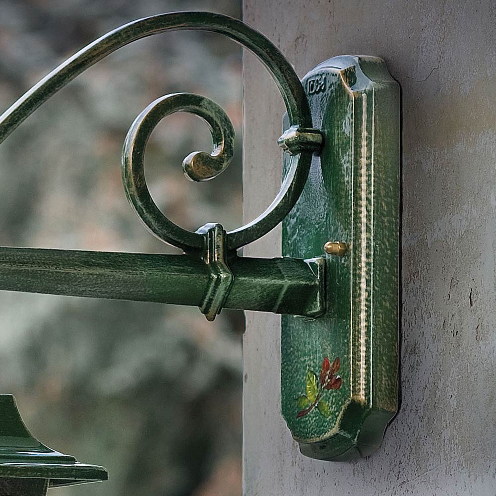 Denne udendørs væglampe er udelukkende lavet af grøn aluminium med en guldskærm dekoreret med håndmalede blomster for en klassisk og harmonisk stil mellem form og farver.