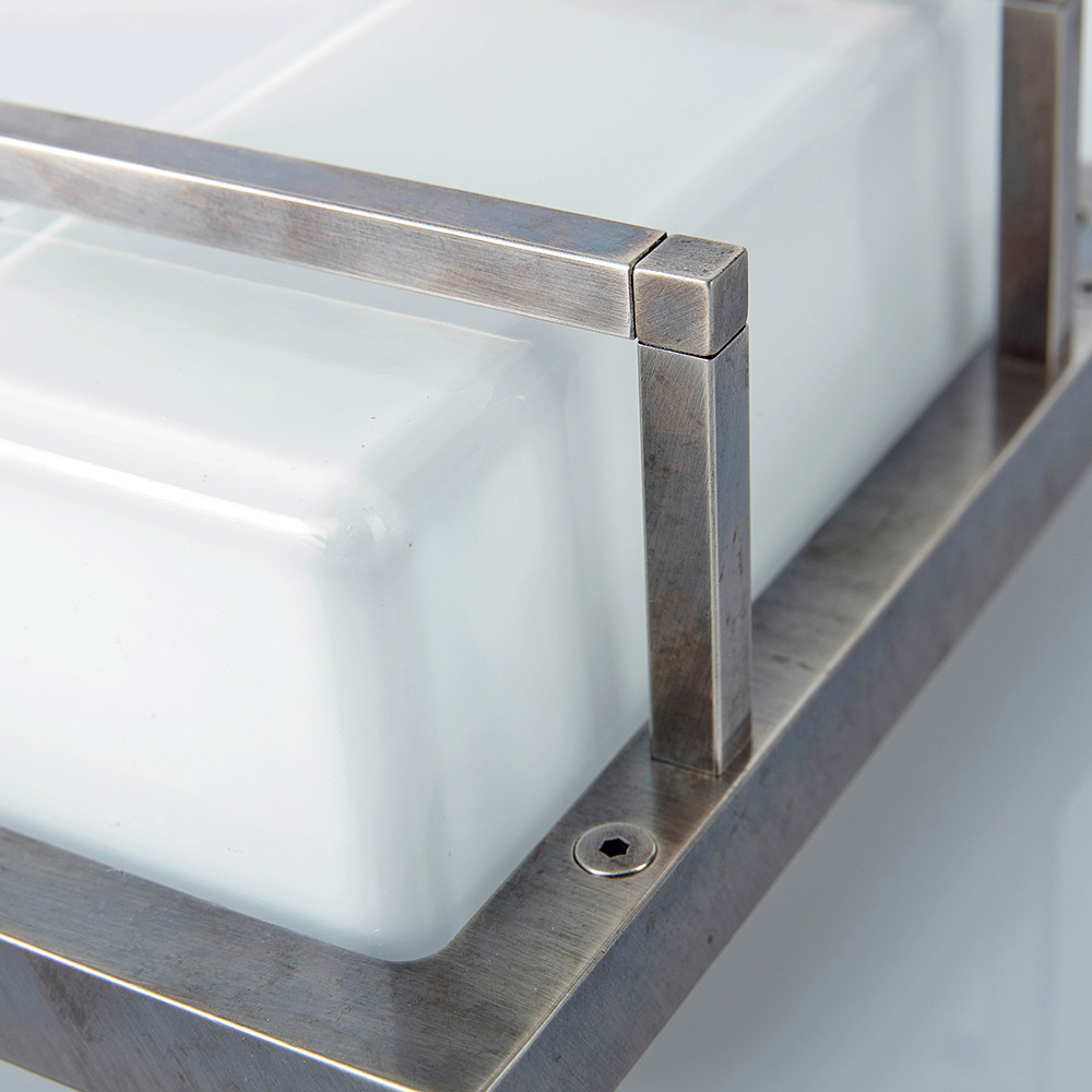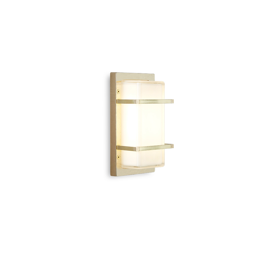 Denne håndlavede væglampe er enkel og elegant og er en raffineret belysningsløsning, designet til at forbedre moderne vægge og nutidige rum. Den støbte messingstruktur kombineret med en rektangulær opalglasdiffusor skaber et blødt, jævnt lys, der er ideelt til indbydende og funktionel belysning.