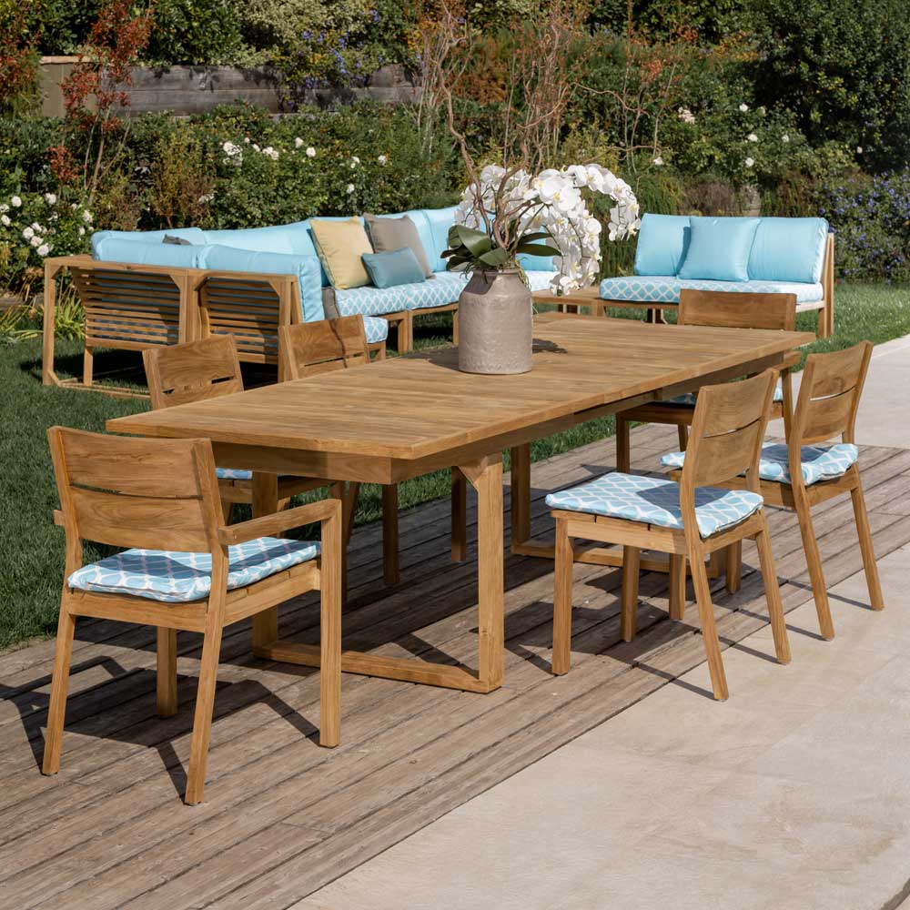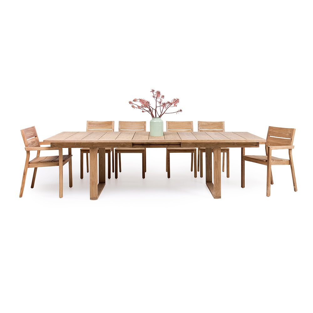 Udtrækkeligt havebord til 270 cm i teaktræ med en naturlig børstet finish.