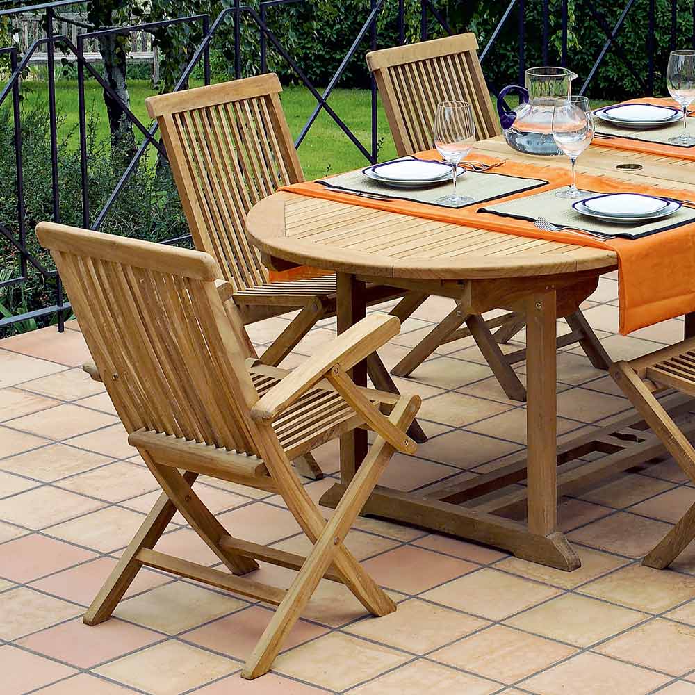 Udtrækkeligt havebord i teaktræ med stole og lænestole.