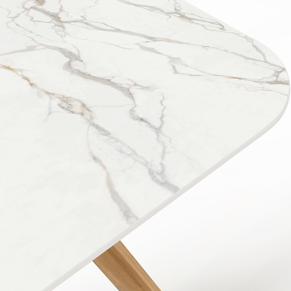 fremstillet i Italien. Dette udendørsbord med en Calacatta Oro keramikplade er en hyldest til tidløs elegance og subtil luksus. Det kombinerer en varm og indbydende træbase med en keramisk bordplade, der perfekt efterligner Calacatta Oro-marmor, kendt for sine unikke gyldne årer mod en hvid baggrund.