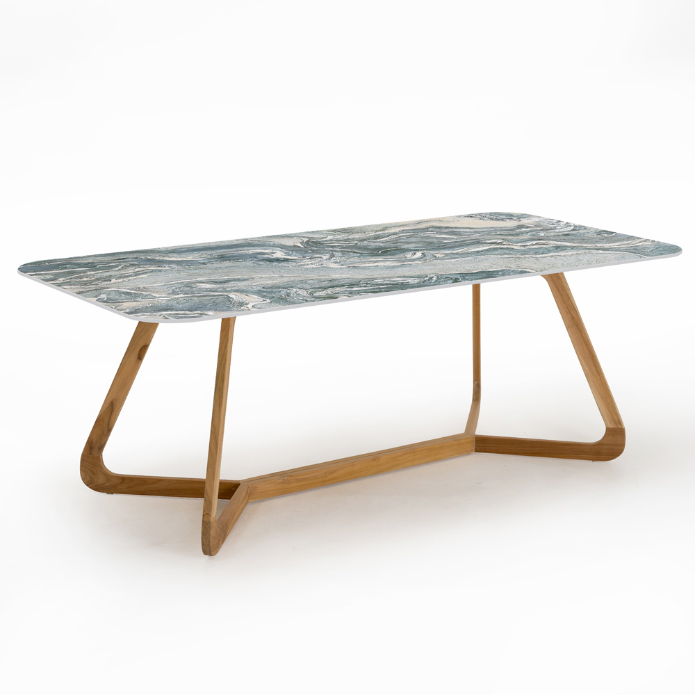 Den massive træbund med sine bugtede og naturlige linjer skaber en harmonisk kontrast til den moderne keramiske bordplade og kombinerer styrke og stil i ét design. Vores bord er perfekt til ethvert udendørsområde, fra haver til de mest raffinerede hotel- og restaurantmiljøer, og det er designet til at modstå elementerne, hvilket sikrer holdbarhed og skønhed.