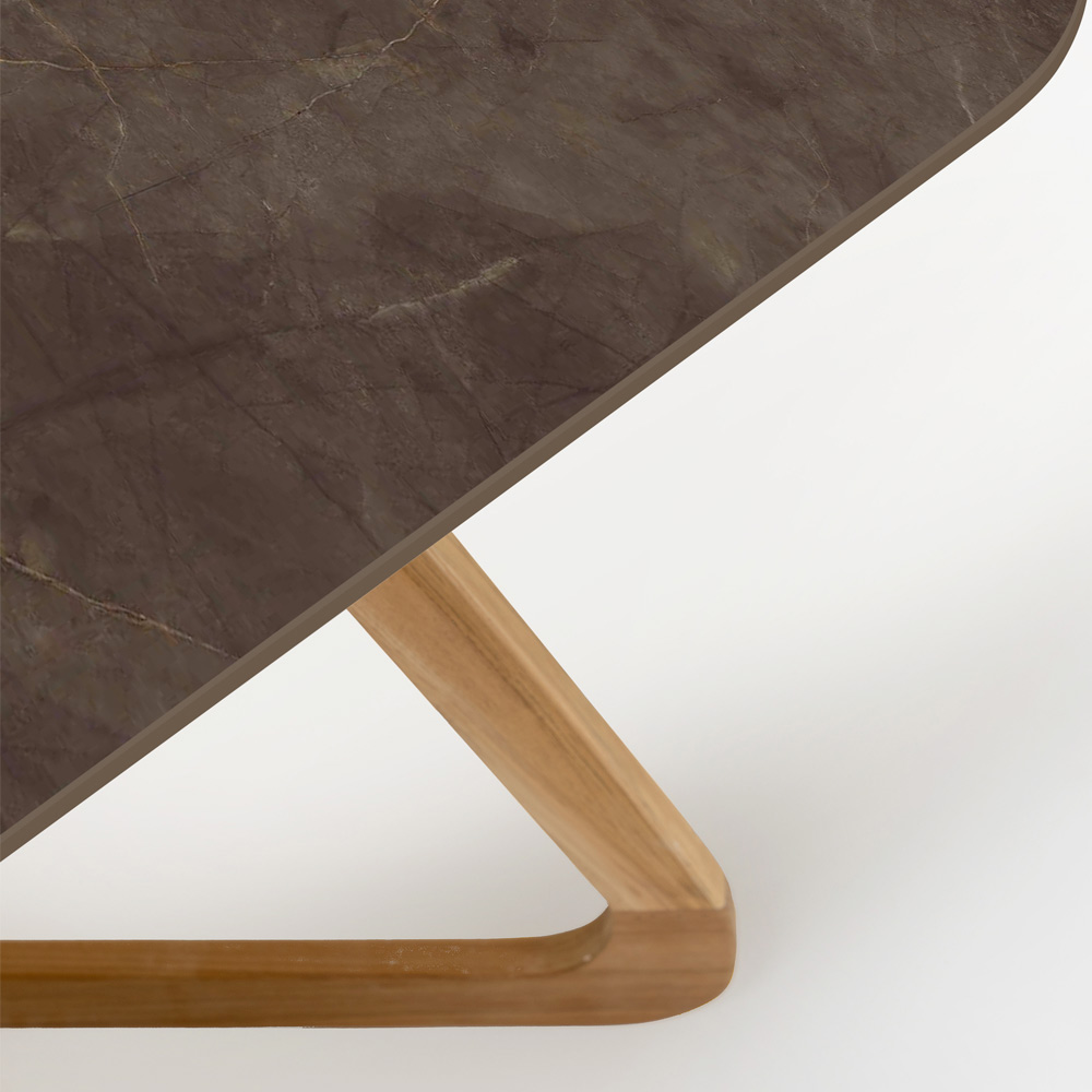fremstillet i Italien. Dette udendørsbord med en Pulpis Brown keramikplade er et sofistikeret designvalg for dem, der ønsker at bringe et strejf af jordnær elegance til deres udendørsområde. Bordet kombinerer en træbase med en keramisk bordplade, der efterligner Pulpis Brown marmor, kendt for sin dybe brune farve og subtile, lysere årer på tværs af overfladen.