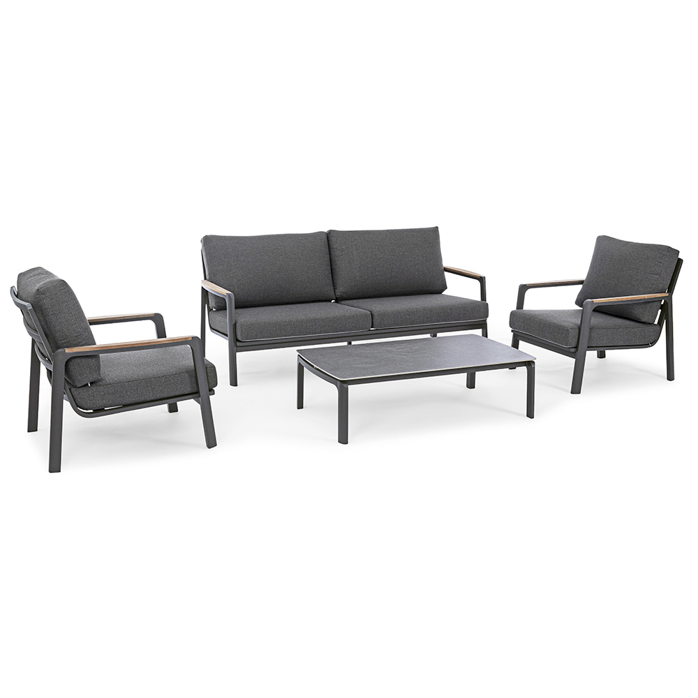 Pulverlakeret aluminiumsstruktur (polyester). Armlæn med teakindsatser . Sæde- og rygpuder med aftagelige betræk med akrylstof .