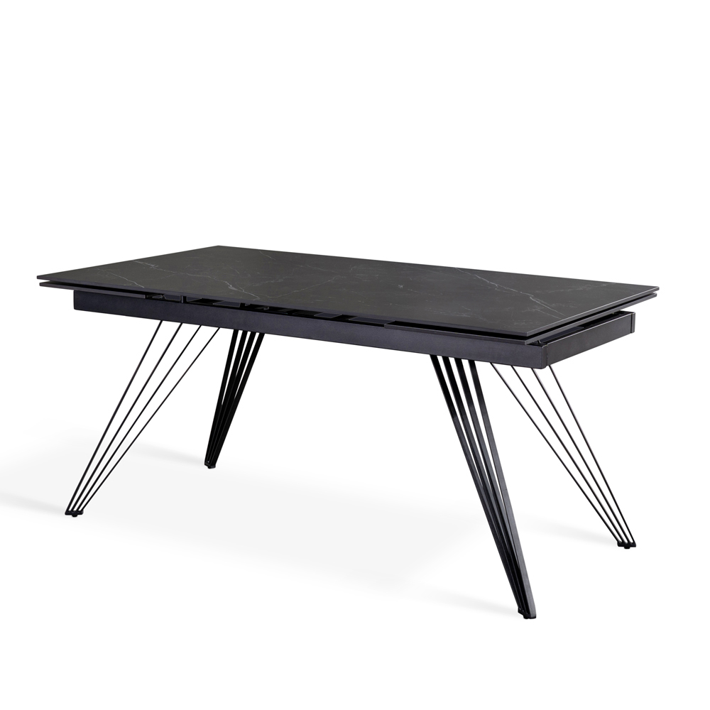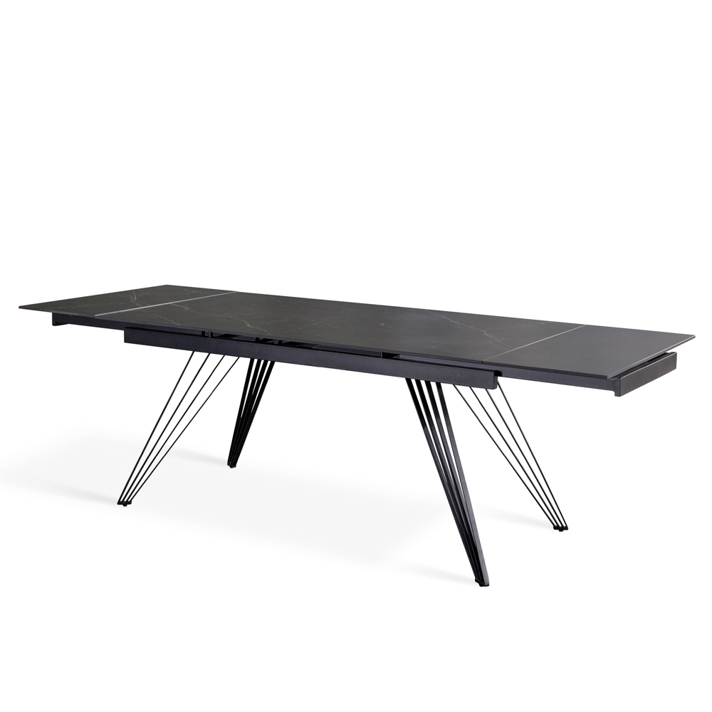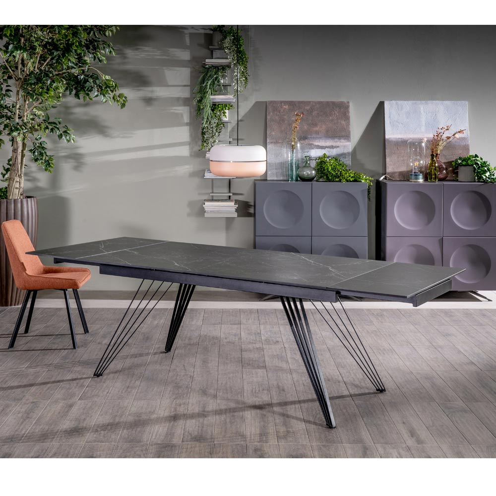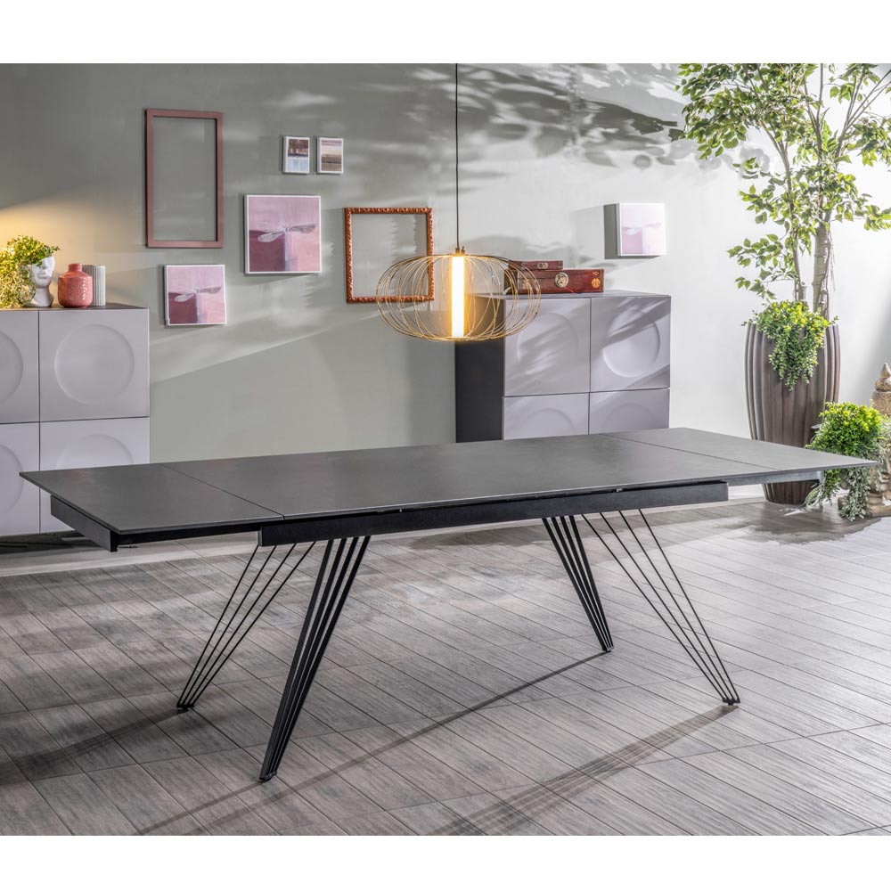 Det, der fanger opmærksomheden, er den udtryksfulde kraft af dette udtrækbare bord i en moderne og industriel stil. Dens design er kendetegnet ved den elegante top lavet af keramik, som smagfuldt matcher den solide metalbund. Det tilbyder mange mulige kombinationer mellem finishen på den rektangulære top og finishen på basen, hvilket tilfredsstillende personligt udtryk og smag og afspejler ånden i den kontekst, hvori den er indsat. Takket være dens udvidelsesmuligheder kan den rumme op til 10 personer og bliver den perfekte allierede til at skabe unikke og varme hyggelige rum.