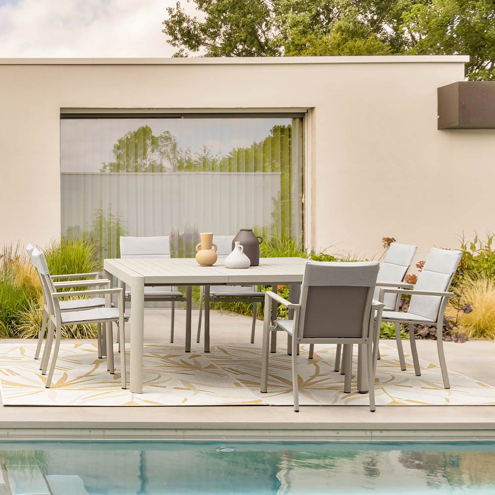 Dette havebord er en sand juvel af minimalistisk og funktionelt design . Dens højkvalitets aluminiumsoverflade, karakteriseret ved rene linjer, fremkalder en moderne og sofistikeret stil, der ikke går ubemærket hen. De neutrale farver gør den ekstremt alsidig og velegnet til ethvert udendørs miljø, fra den urbane altan til terrassen på en landvilla. Ikke kun æstetisk tiltalende, men også ekstremt praktisk og holdbart ; Dette bord er bygget til at modstå elementerne, hvilket sikrer holdbarhed og stabilitet over tid. Med sine enkle linjer og elegante silhuet bliver dette bord hovedpersonen i ethvert hyggeligt udendørs øjeblik og tilbyder maksimal komfort og gæstfrihed . Et udtryk for ren moderne stil , dette havebord er det ideelle valg for dem, der elsker at byde velkommen, leve og dele deres liv i det fri med klasse og enkelhed .