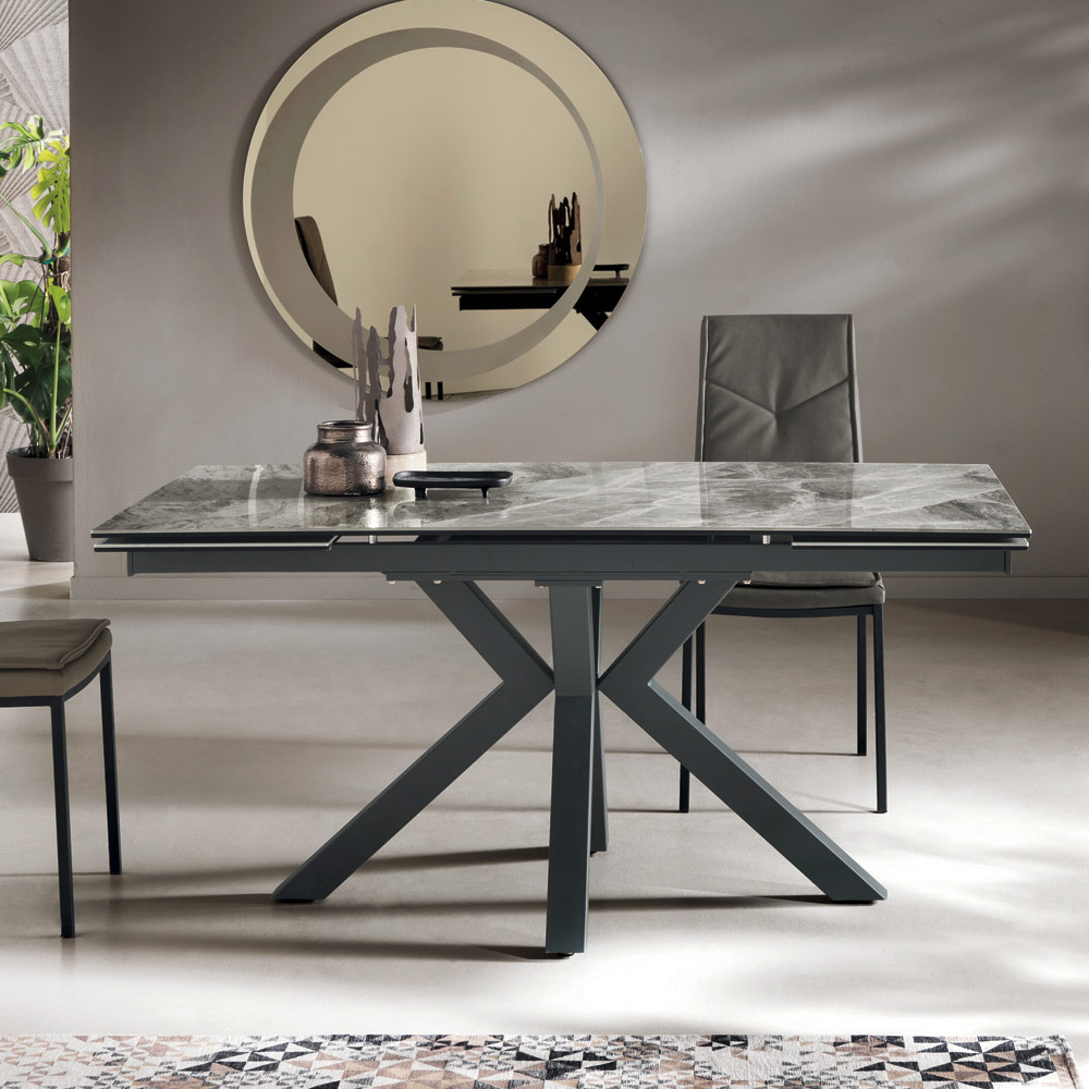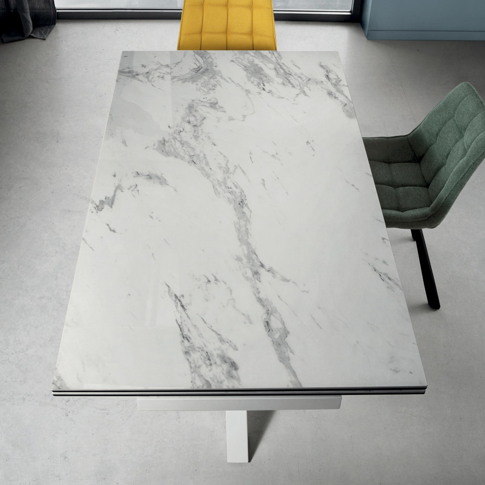 Udtrækkeligt spisebord med marmor-effekt porcelæns stentøjsplade og malet metalbund med enkle og moderne linjer, der er i stand til at give karakter til dit miljø. Udstyret med 2 sidetillægsplader á 40 cm og en rotationsmekanisme , der gør det muligt at forlænge bordpladen hurtigt og nemt for et funktionelt og særligt originalt resultat.