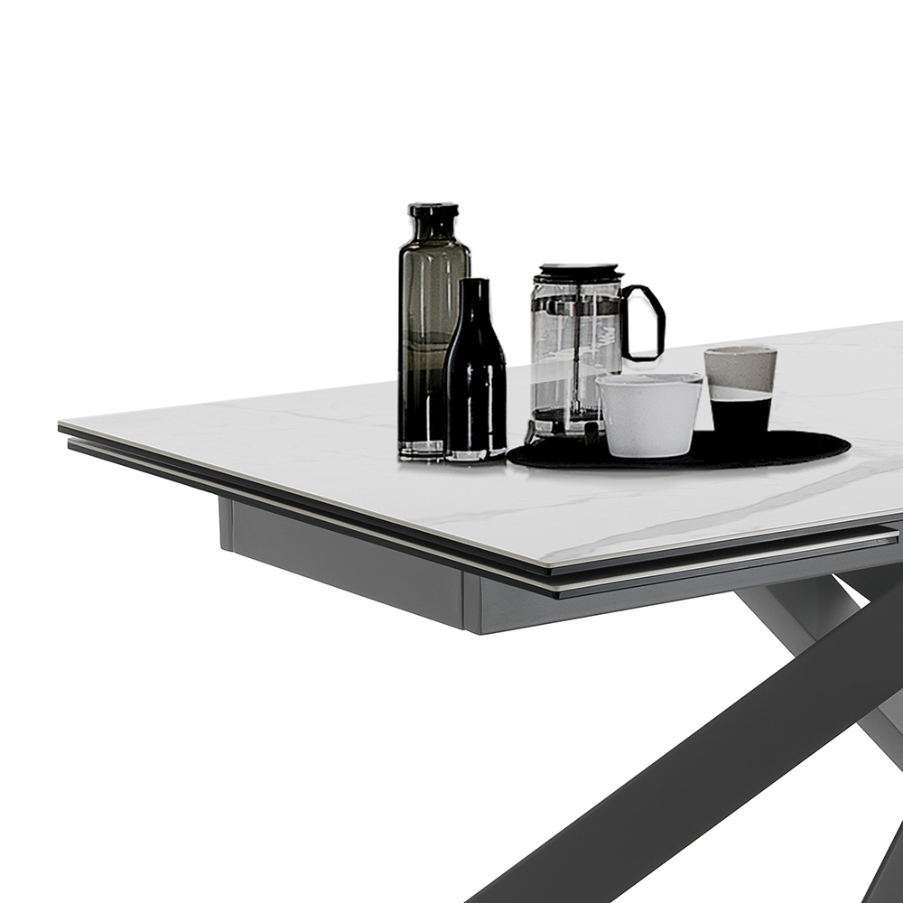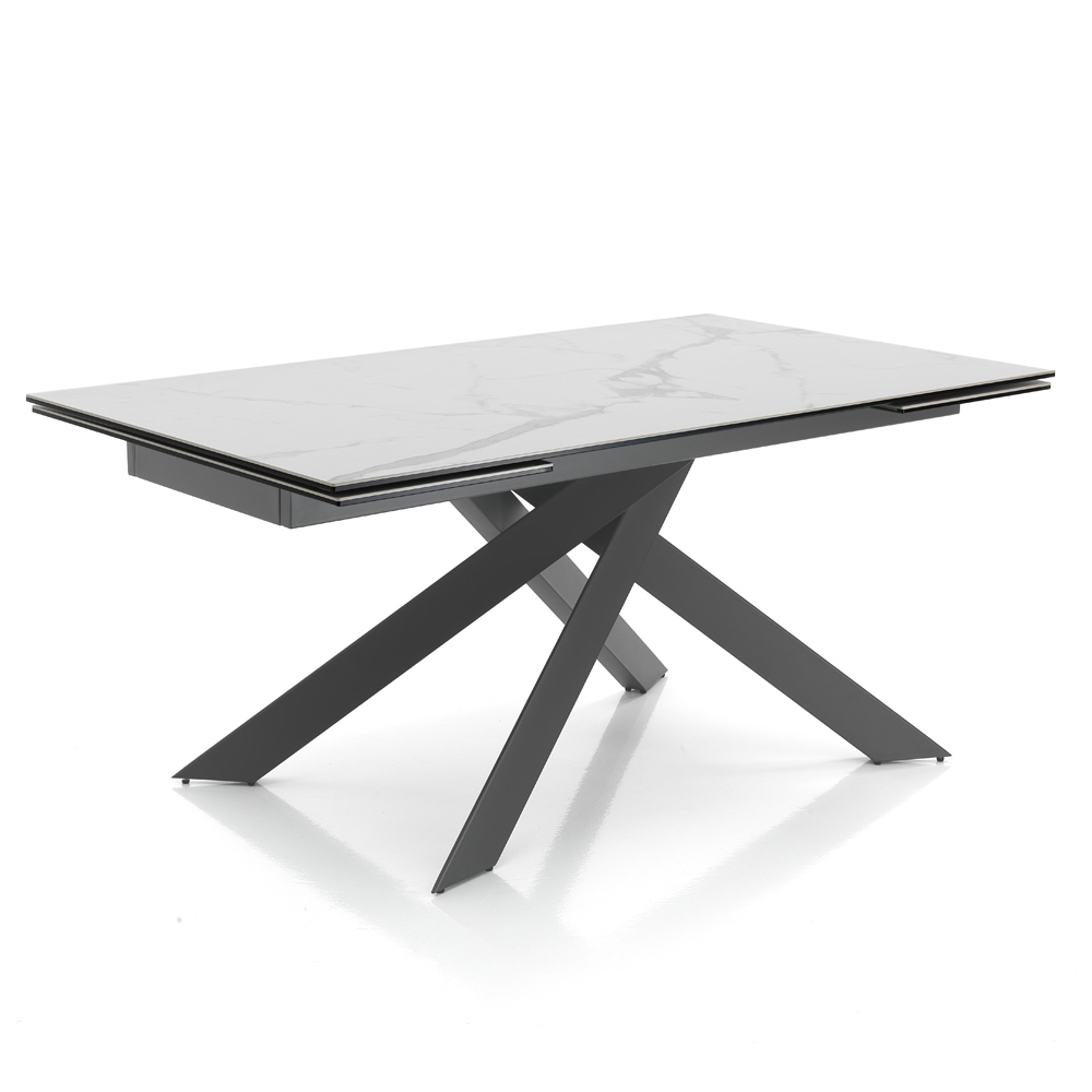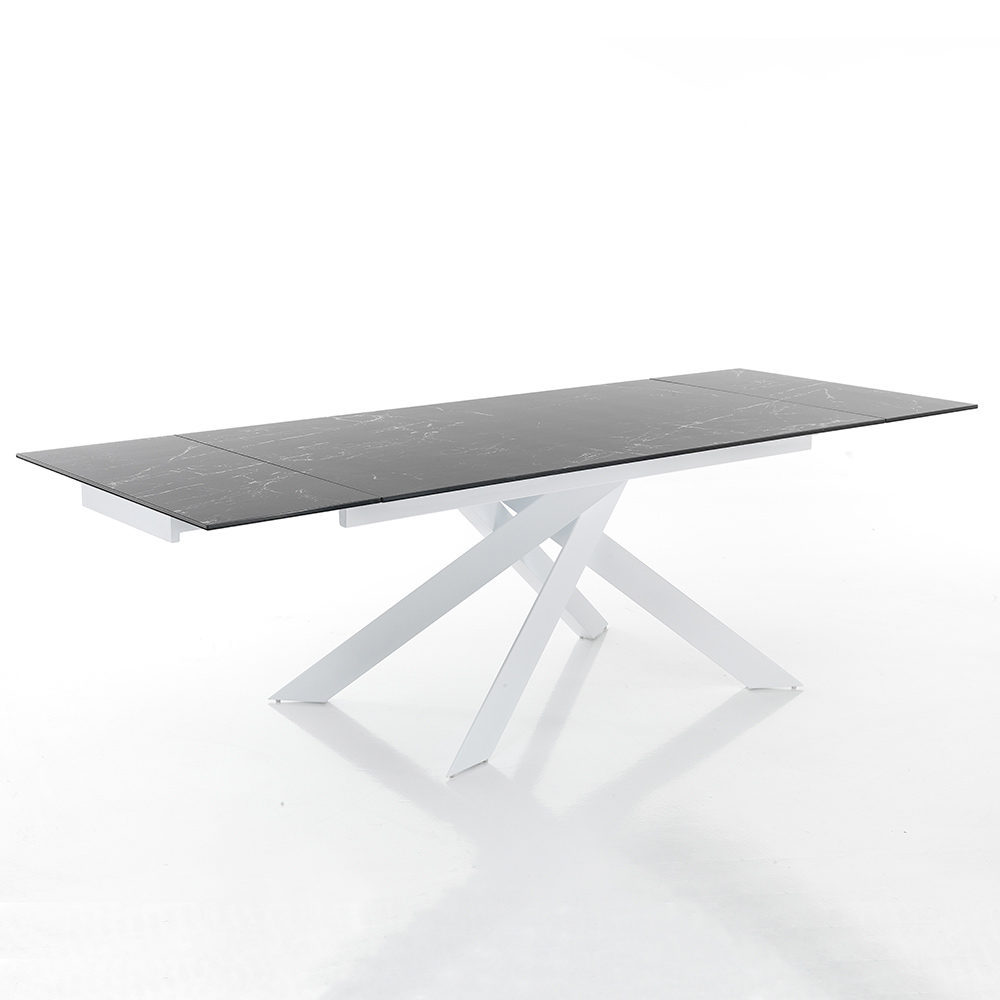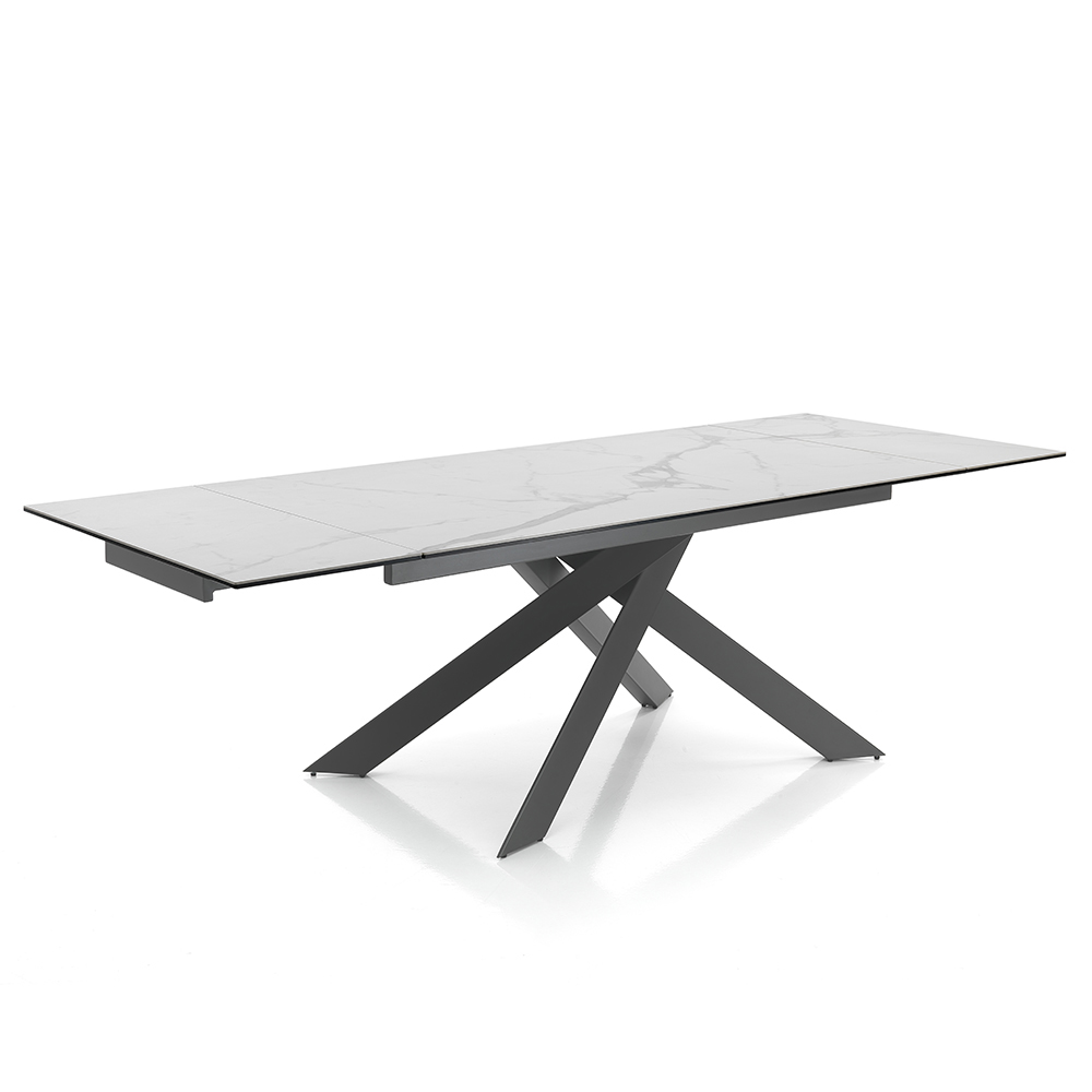 Udtrækkeligt spisebord i keramik med marmor- og ståleffekt.