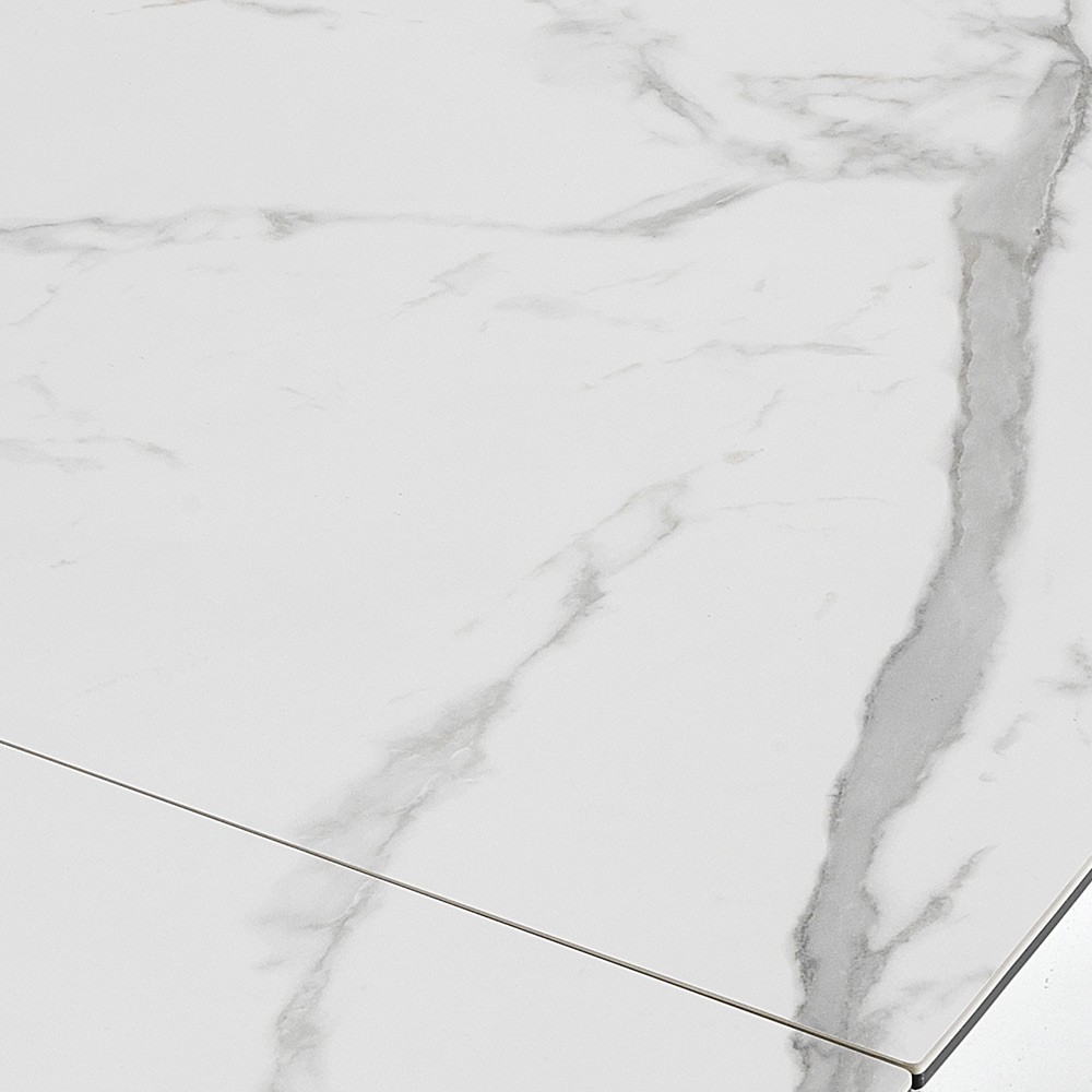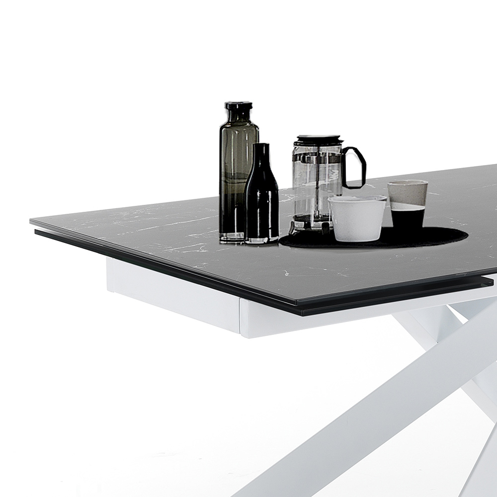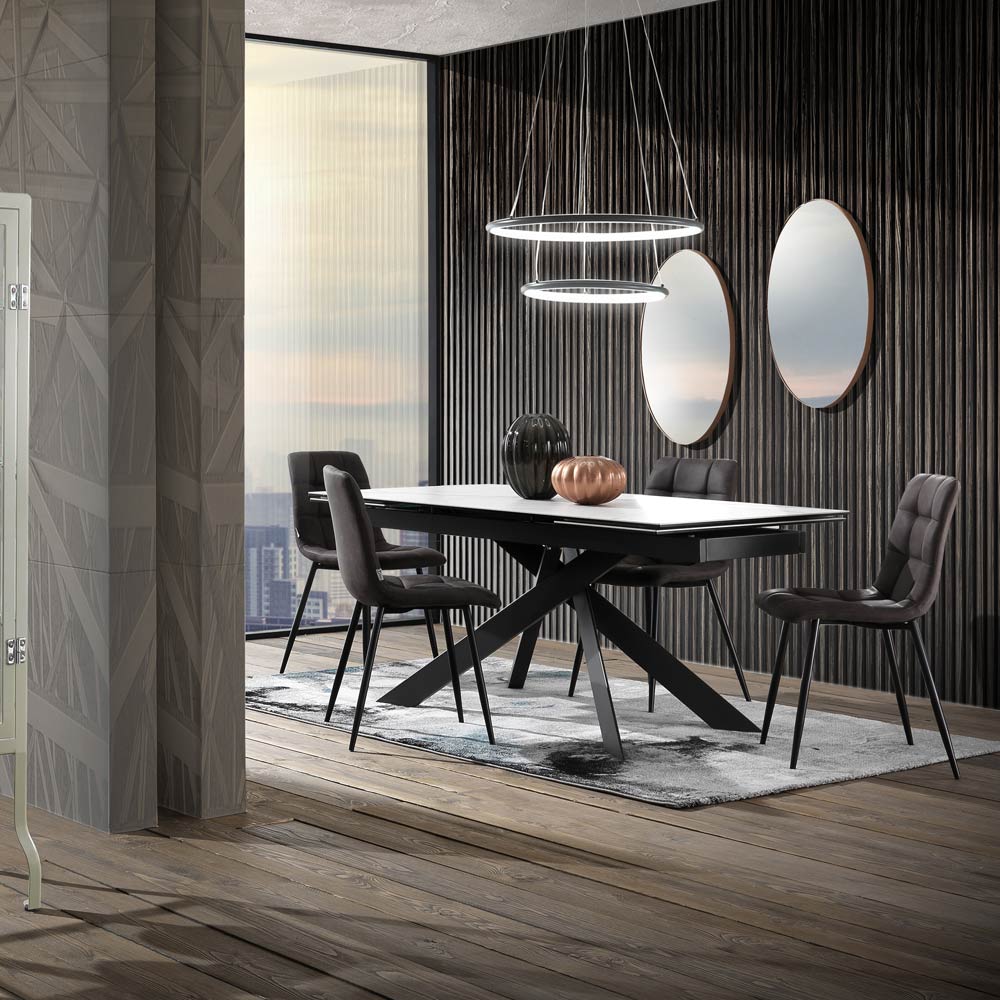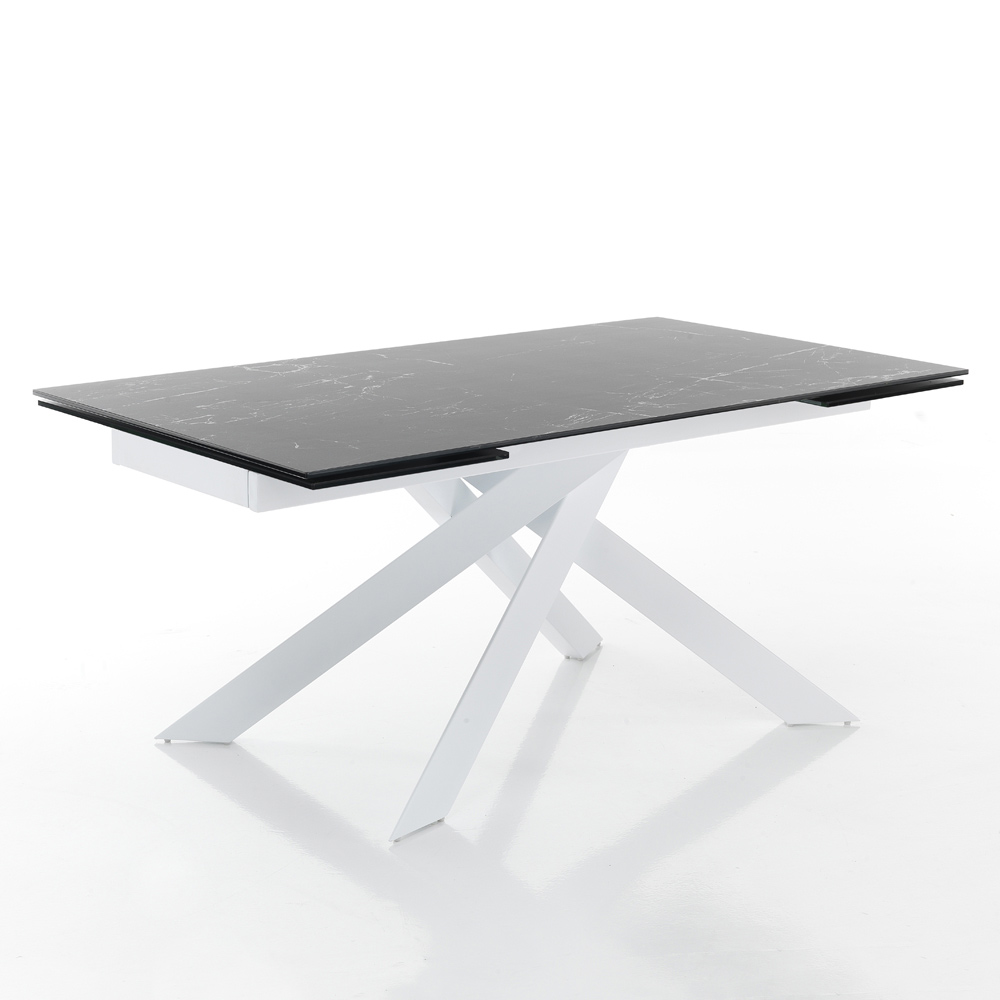 Udtrækkeligt spisebord i keramik med marmor- og ståleffekt.