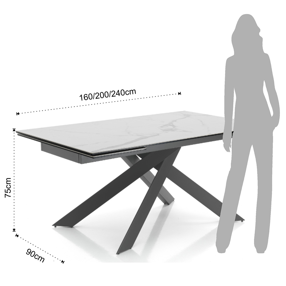 malet stålstruktur . Takket være de to forlængere på hver 40 cm placeret under toppen, kan bordet nå en maksimal længde på 240 cm, så det kan rumme et større antal gæster til vidunderlige frokoster og middage med venner. Den perfekte kombination af keramikkens elegance og stålbasens imponerende detaljer skaber et møbel med en