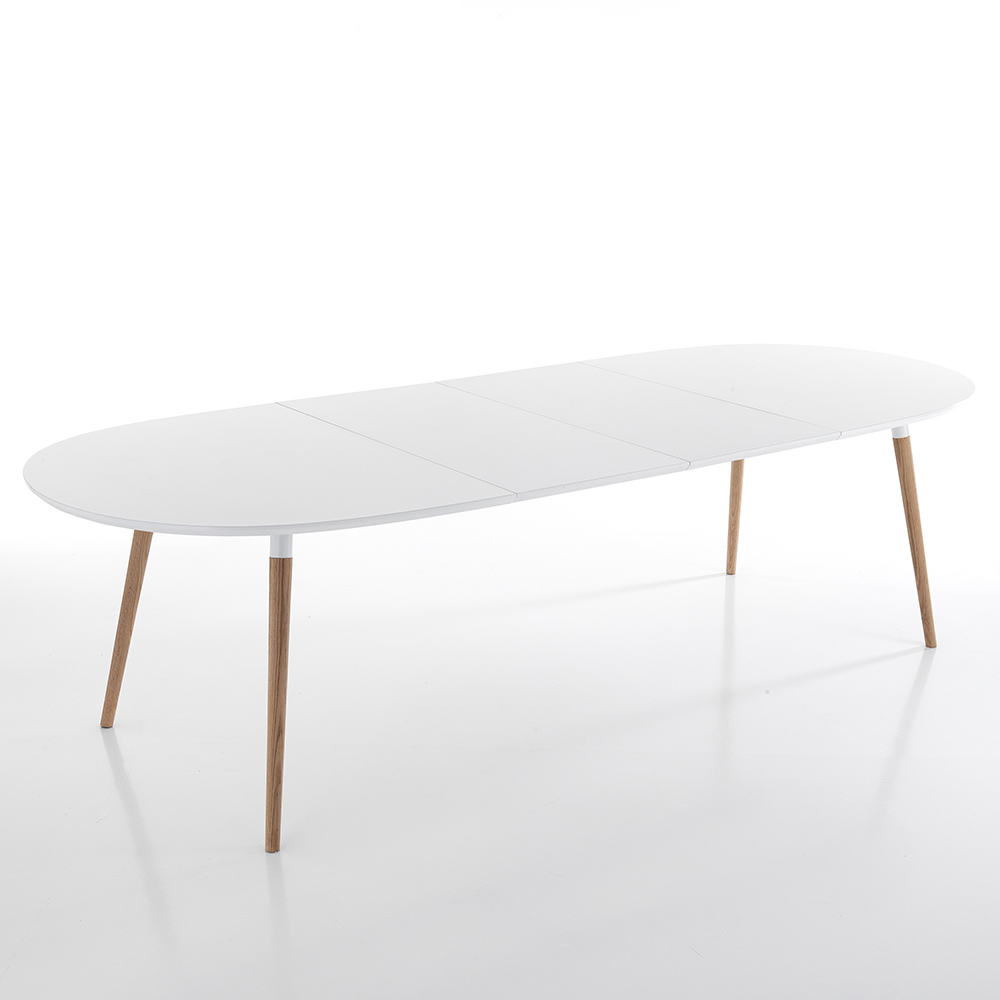 Udtrækbart spisebord i mat hvid mdf og massivt træ.