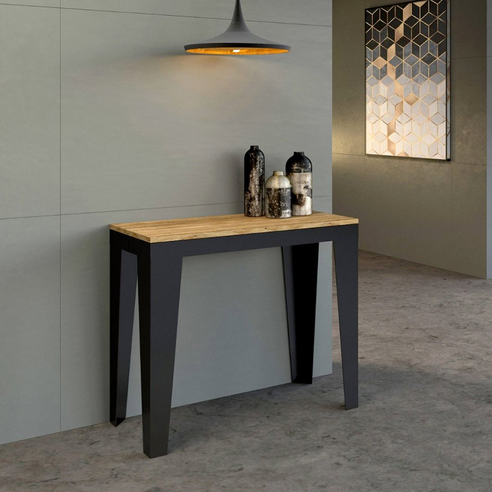 Dette udtrækkelige konsolbord er indbegrebet af opfindsomhed og elegant design. Dets sofistikerede look e givet af kombinationen af skarpe linjer og kontrastfarver med slanke ben i antracitfarvet metal, der understøtter en top i træ, hvilket skaber en slående visuel balance.