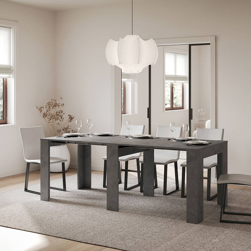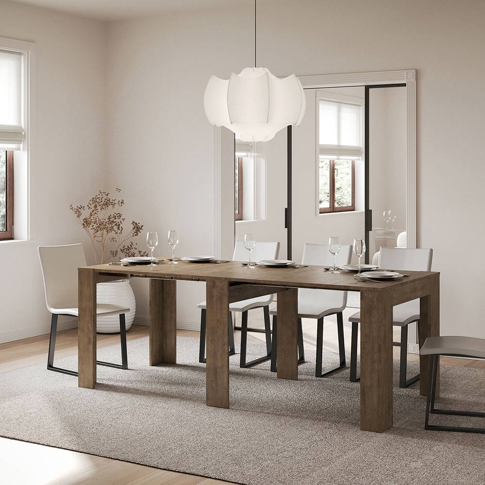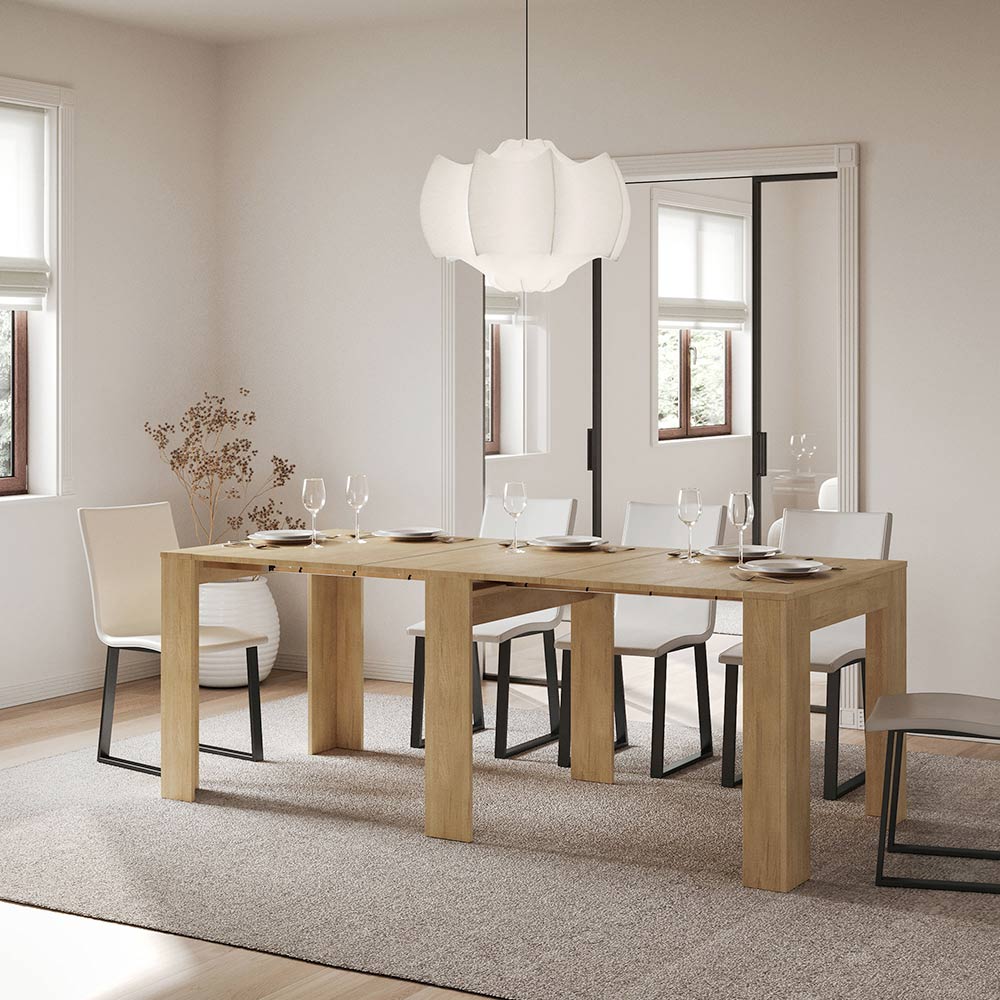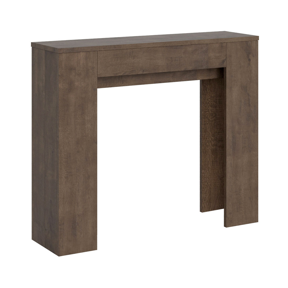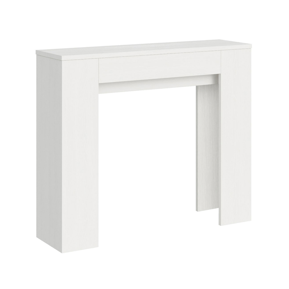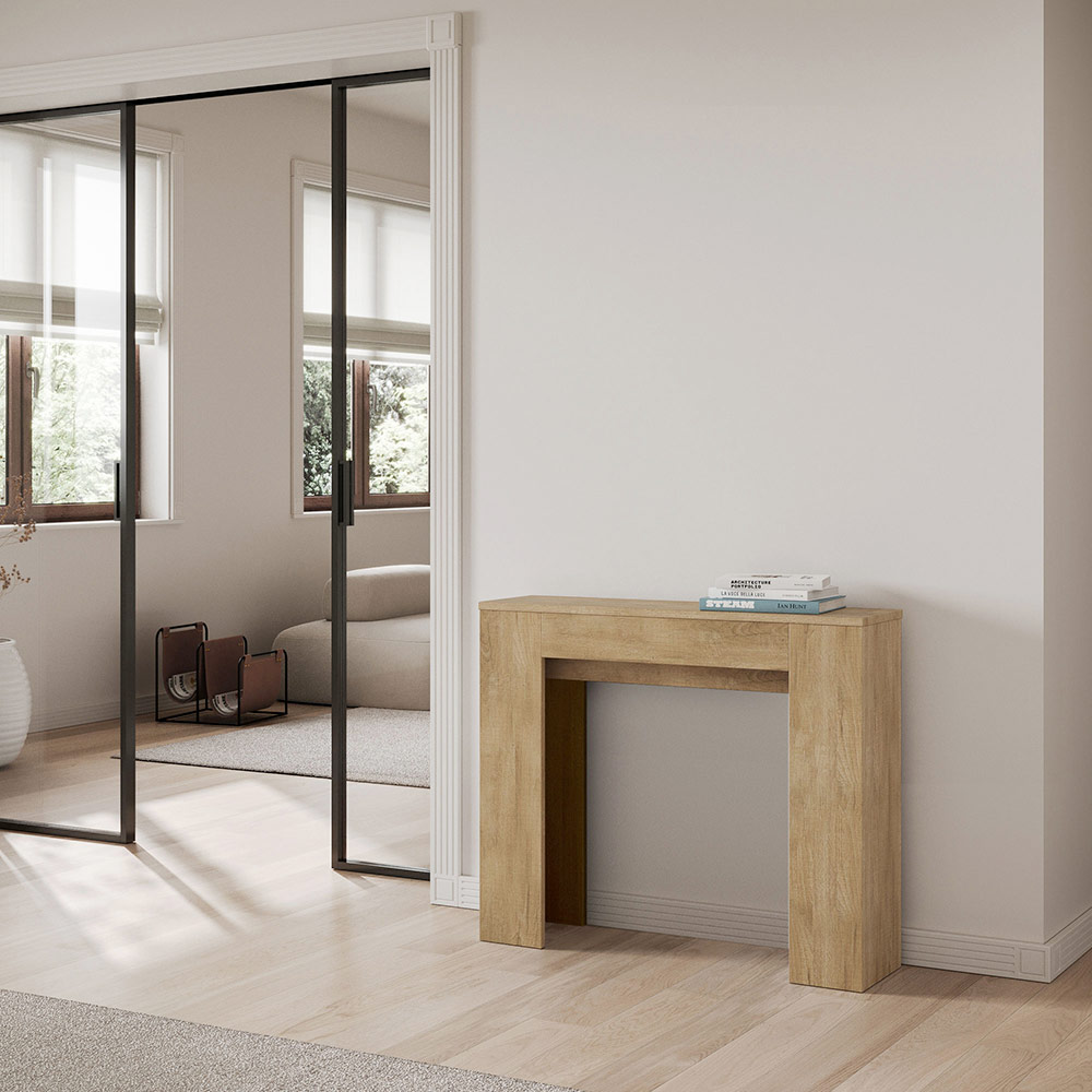 Dette udtrækkelige konsolbord er indbegrebet af funktionelt og minimalistisk design. Dets slanke form og rene linjer gør det til et alsidigt møbel, der er ideelt til ethvert rum fra entréen til stuen, og som giver et billede af rum og orden. Konsolbordet kan nemt udvides og forvandles fra et diskret møbel til et praktisk spisebord, der er perfekt til at modtage venner og familie ved særlige lejligheder. Denne alsidighed gør det til et ideelt valg for dem, der bor småt, men ikke ønsker at gå på kompromis med funktionalitet og stil.