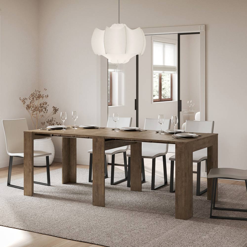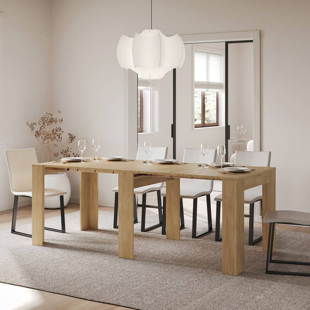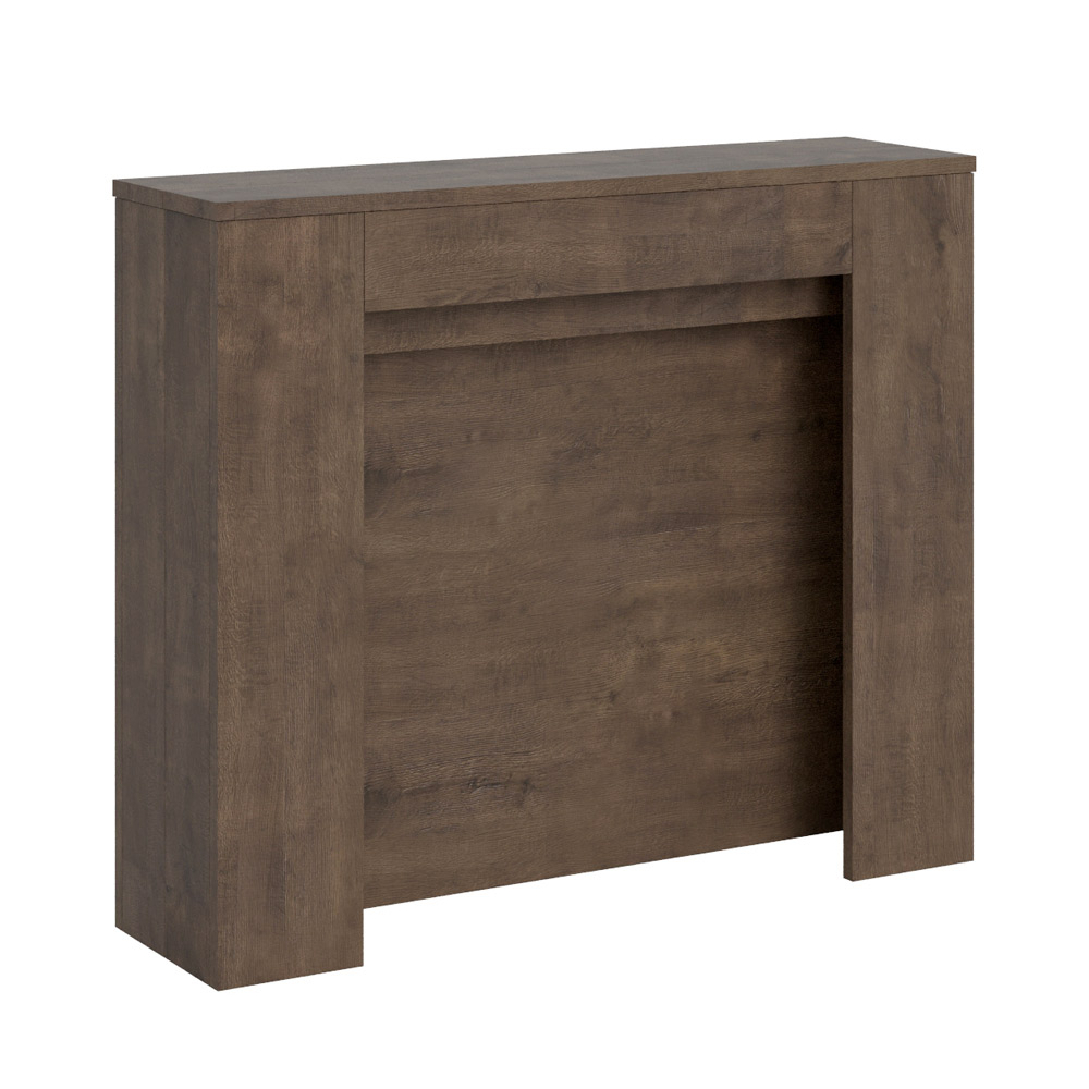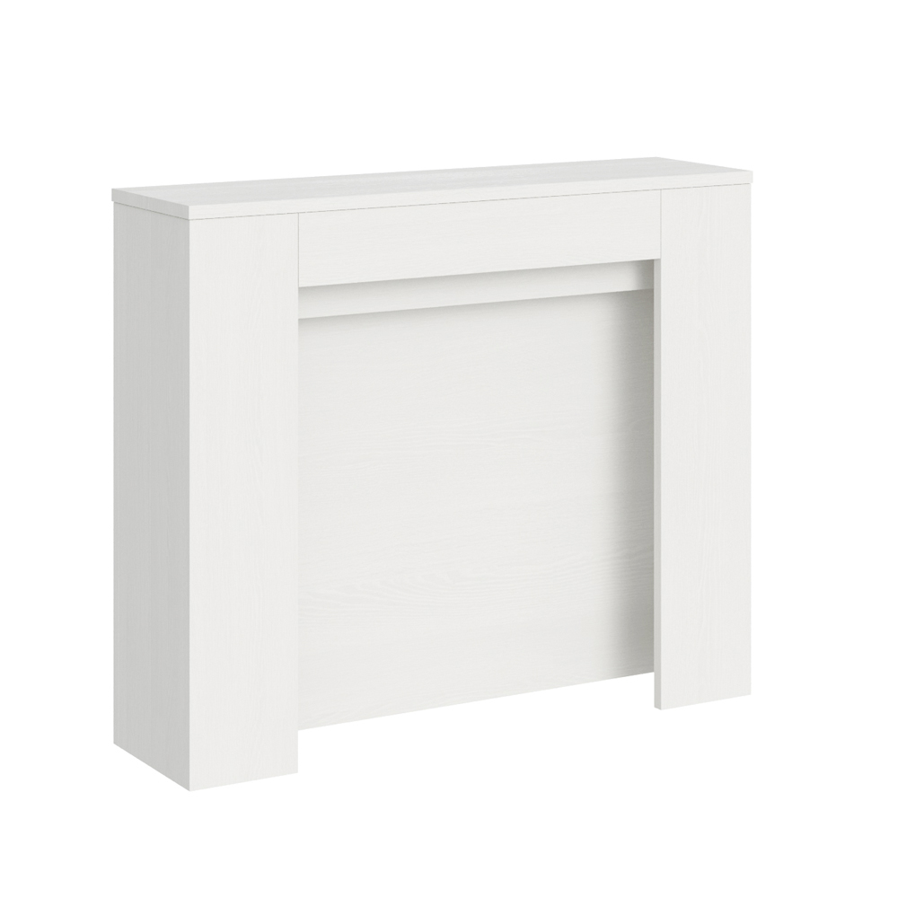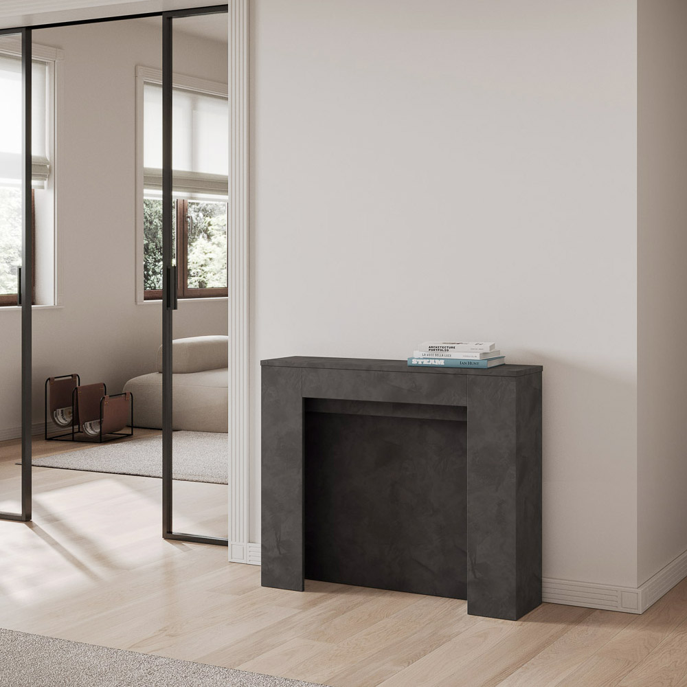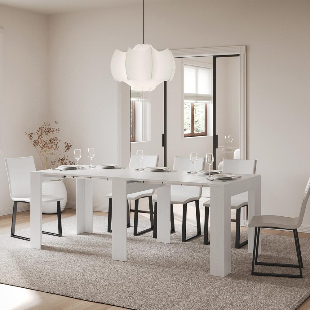 Dette udtrækkelige konsolbord è indbegrebet af funktionelt og minimalistisk design. Dets slanke form og rene linjer gør det til et alsidigt møbel, der er ideelt til ethvert rum fra entréen til stuen og giver et billede af rum og orden. Konsolbordet kan nemt udvides og forvandles fra et diskret møbel til et praktisk spisebord, der er perfekt til at modtage venner og familie ved særlige lejligheder. Denne alsidighed gør det til et ideelt valg for dem, der bor småt, men ikke ønsker at gå på kompromis med funktionalitet og stil.