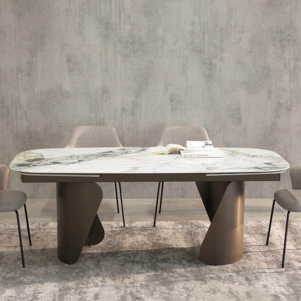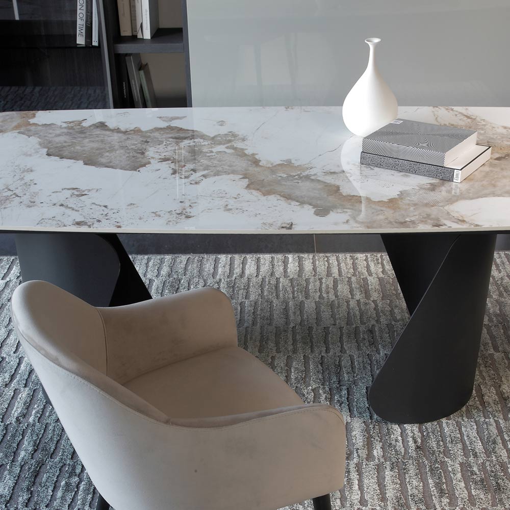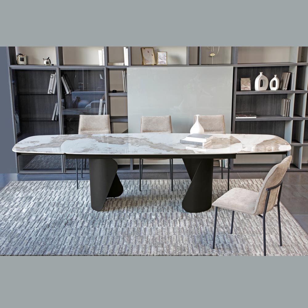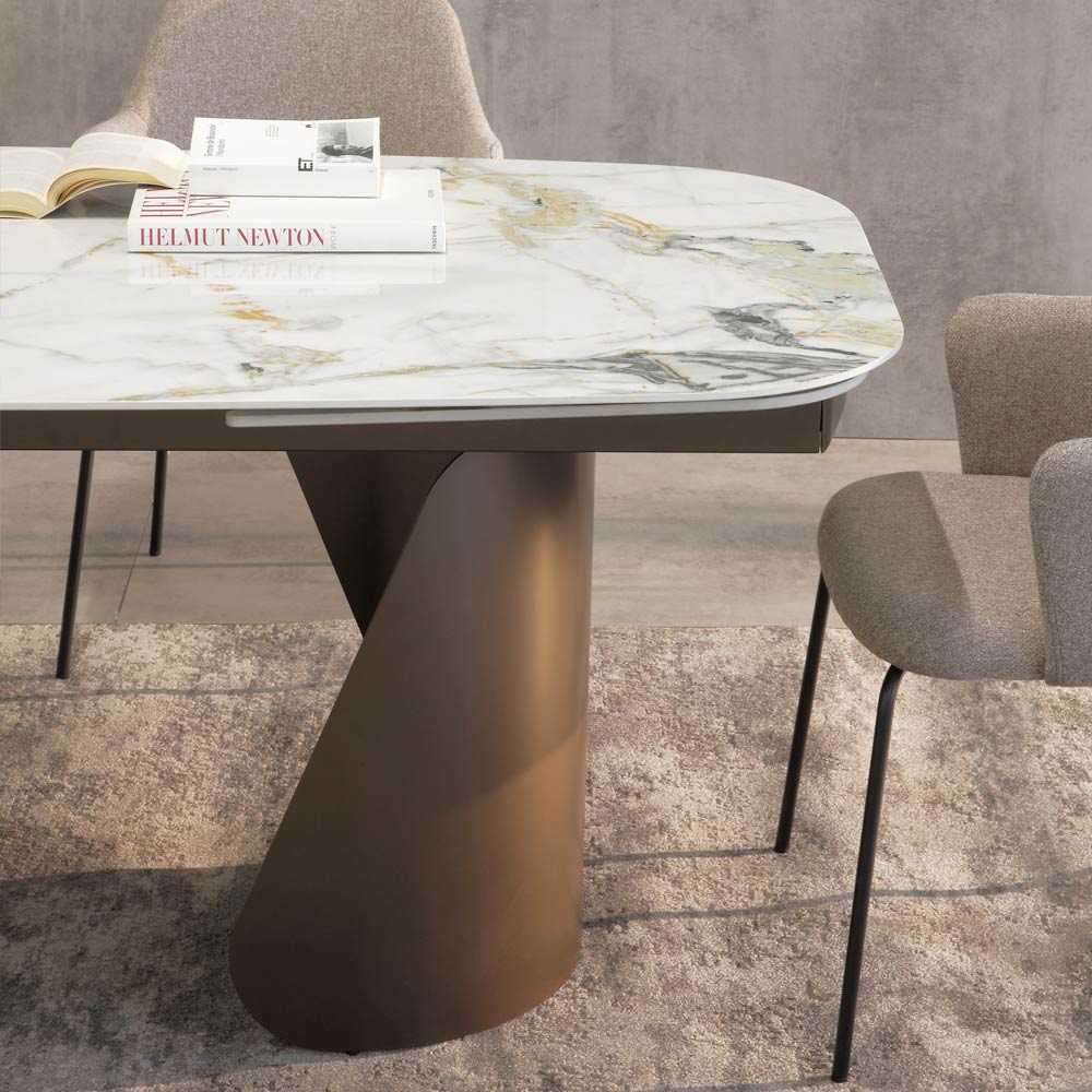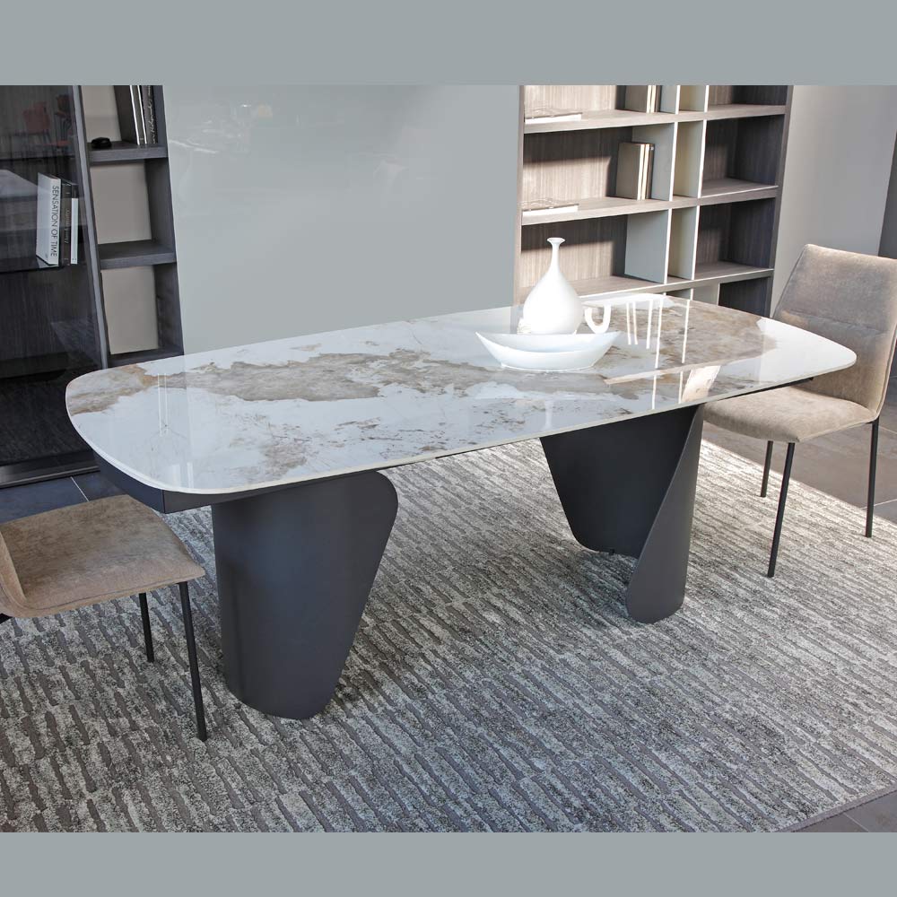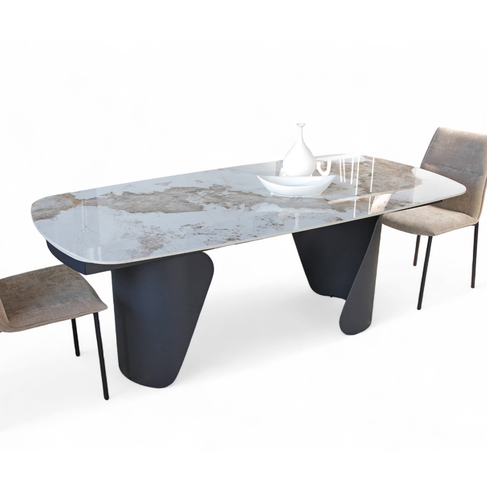 Den skulpturelle base i malet metal giver bordet stabilitet og en stærk karakter, hvilket skaber en interessant materialekontrast til overfladen. Benenes asymmetriske geometriske former tilføjer et kunstnerisk og sofistikeret præg til det overordnede design.