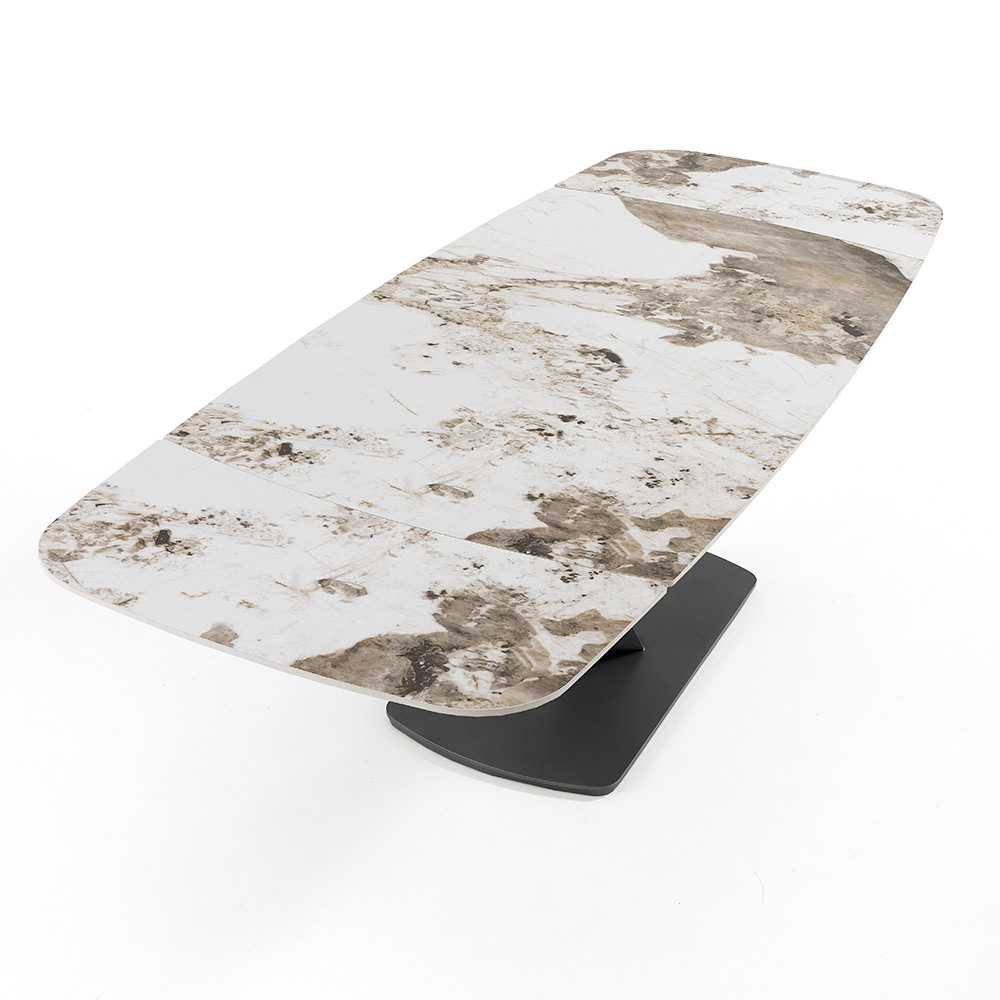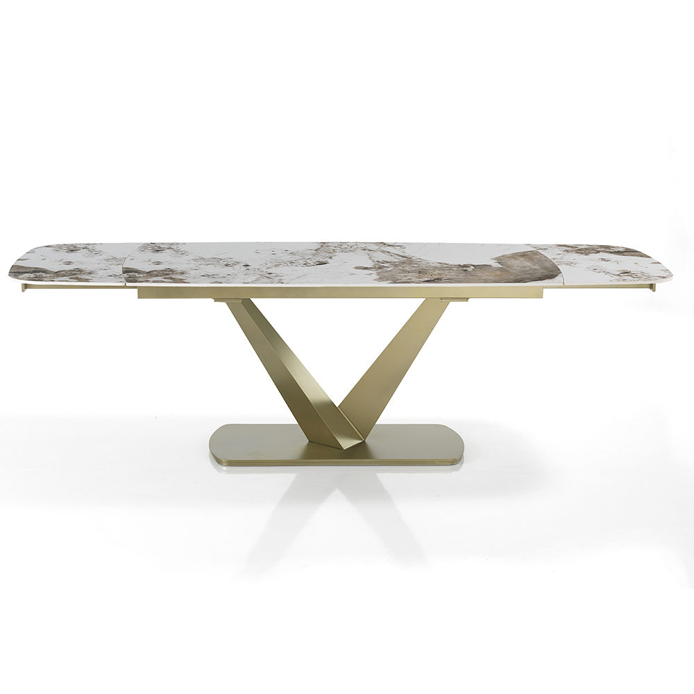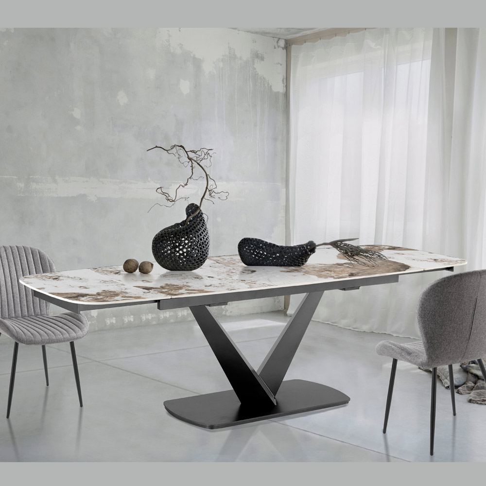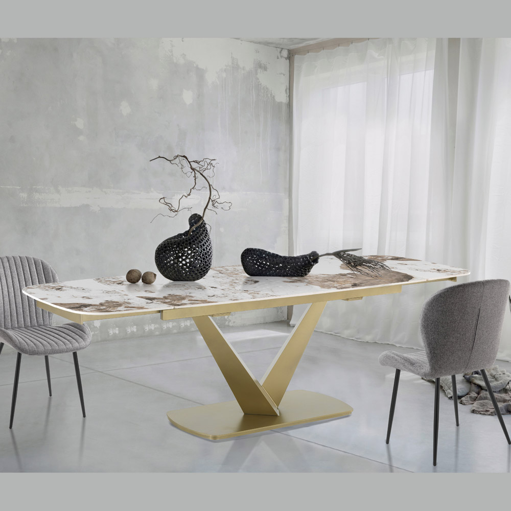 Dette udtrækkelige bord repræsenterer en perfekt syntese af elegance og funktionalitet . Dens marmor-effekt keramiske overflade med spektakulære årer tilbyder en fascinerende farvepalet, der fanger øjet, hvilket gør den til et sandt kunstværk. Den V-formede base understøtter ikke kun toppen solidt, men tilføjer et strejf af moderne luksus til det overordnede design.